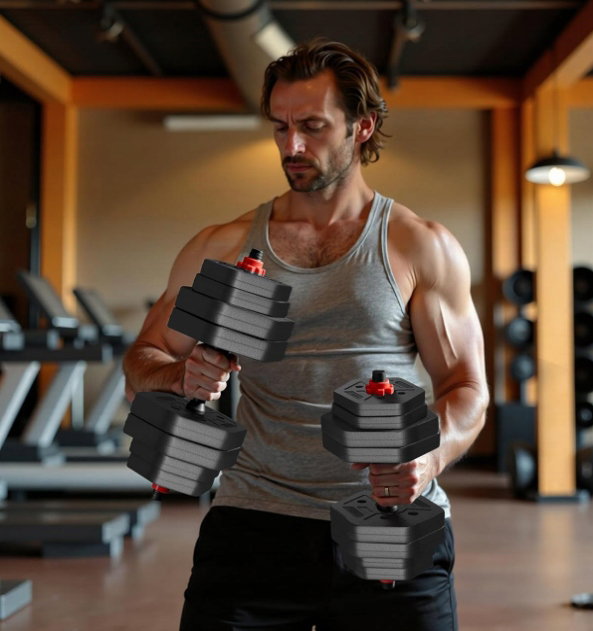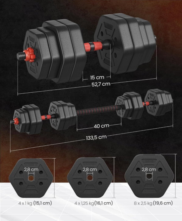 - ✴️Elastyczne zastosowanie: Waga całkowita: 30 kg, w tym 8 x 2,5 kg, 4 x 1,25 kg, 4 x 1 kg talerzy, 4 sztangi, 4 zestawy pierścieni blokujących (po 2 z każdego) i sztanga. Szybkie przełączanie między hantlami i sztangami.