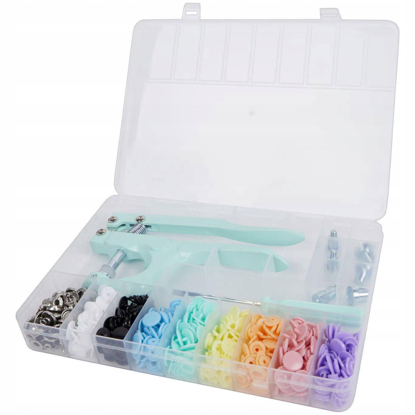 • Zawiera 140 zatrzasków: 120 plastikowych guzików i 20 metalowych zatrzasków