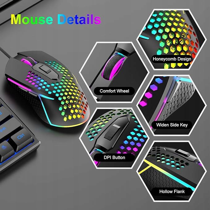 【65g Ultralekka mysz do gier LED】Powierzchnia myszy jest uformowana w plaster miodu, aby zmniejszyć wagę do niesamowitych 95g, co oznacza, że nie będziesz czuć się niekomfortowo po długim czasie użytkowania. A konstrukcja skorupy plastra miodu może zwiększyć rozpraszanie ciepła i zmniejszyć pocenie się. 7 kolorów niesamowitego oświetlenia może spełnić Twoje różne potrzeby dotyczące podświetlenia myszy.