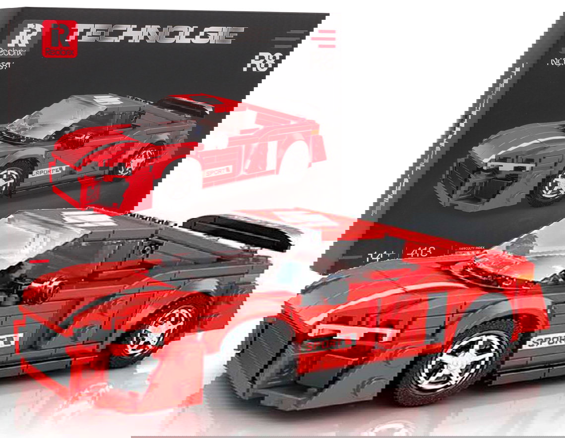 Zestaw 413 klocków konstrukcyjnych do samodzielnej budowy sportowego samochodu R8. Zabawka przeznaczona dla dzieci od 14-go roku życia, a poziom jej trudności to 2/5. Auto posiada wnętrze odwzorowane z detalami, które dobrze widać przez przezroczyste imitacje szyb. W zestawie dołączono instrukcję obrazkową. Układanie klocków konstrukcyjnych rozwija u dzieci zdolności manualne, wyobraźnię przestrzenną i cierpliwość.