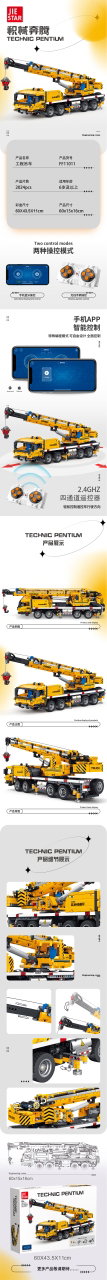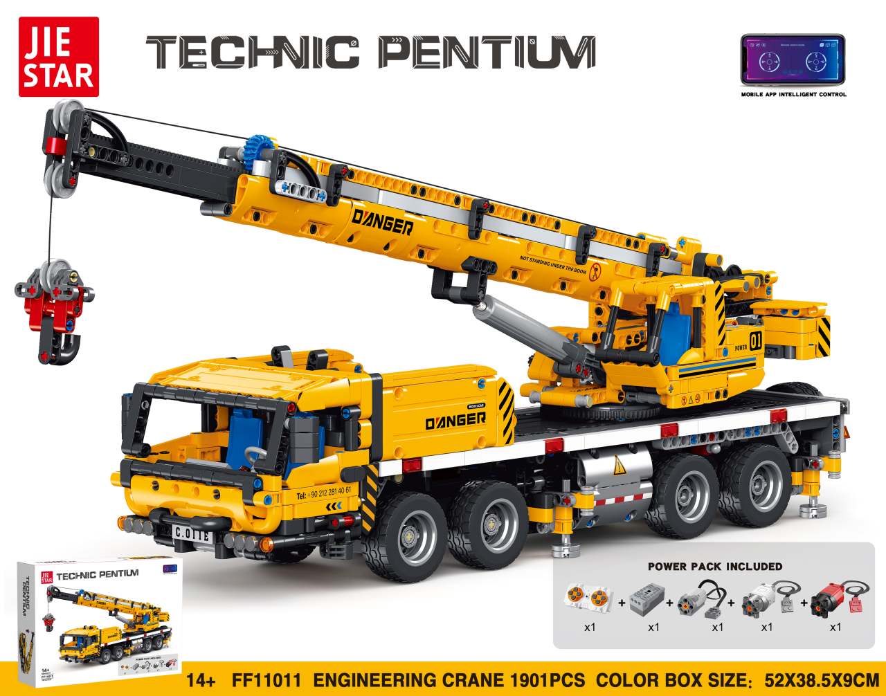 Zestaw 1901 klocków konstrukcyjnych do samodzielnego złożenia pojazdu budowlanego dźwigu do zdalnego sterowania. Zabawka przeznaczona dla dzieci od 14-go roku życia. Dźwig posiada wiele ruchomych elementów, jak kabina obracająca się o 360 stopni. Dodatkowo, można manualnie ruszać ramieniem dźwigu w płaszczyznach góra-dół i przód-tył, za pomocą specjalnych zębatek.