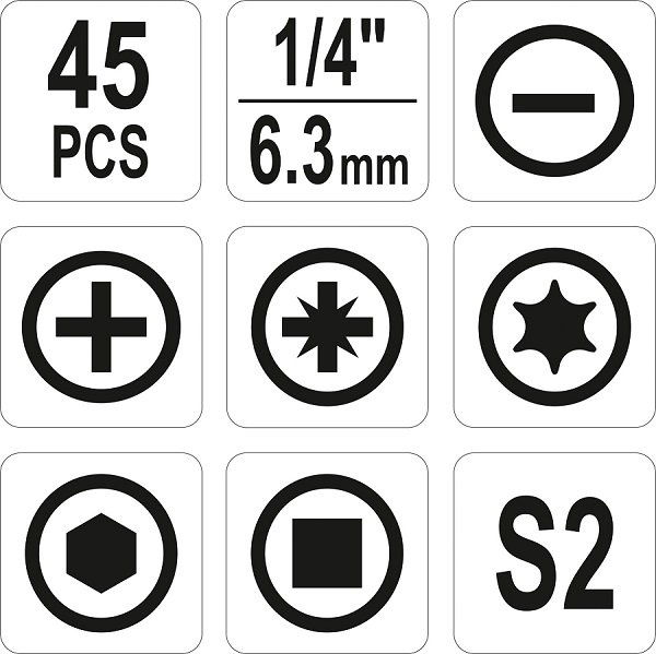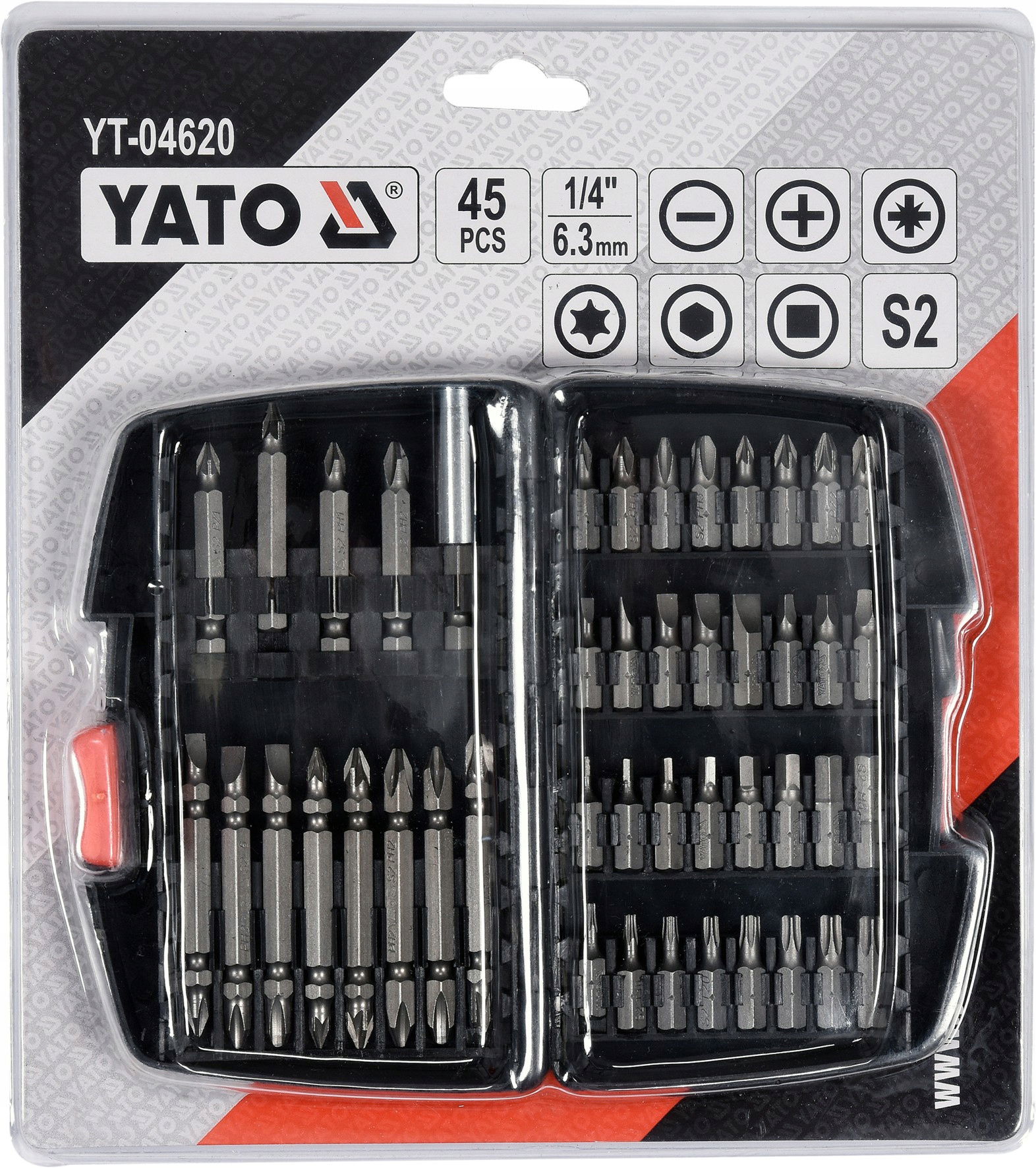 Profesjonalny zestaw końcówek śrubokrętowych marki YATO YT-04620. Przeznaczone do dokręcania i odkręcania śrub w trudno dostępnych miejscach. Polecane dla serwisów samochodowych oraz pasjonatów motoryzacji. Zawierają funkcjonalne końcówki wykonane ze stali kwasoodpornej AISI S2 oraz adapter. Pakowane w kasetki z czytelnymi oznaczeniami elementów