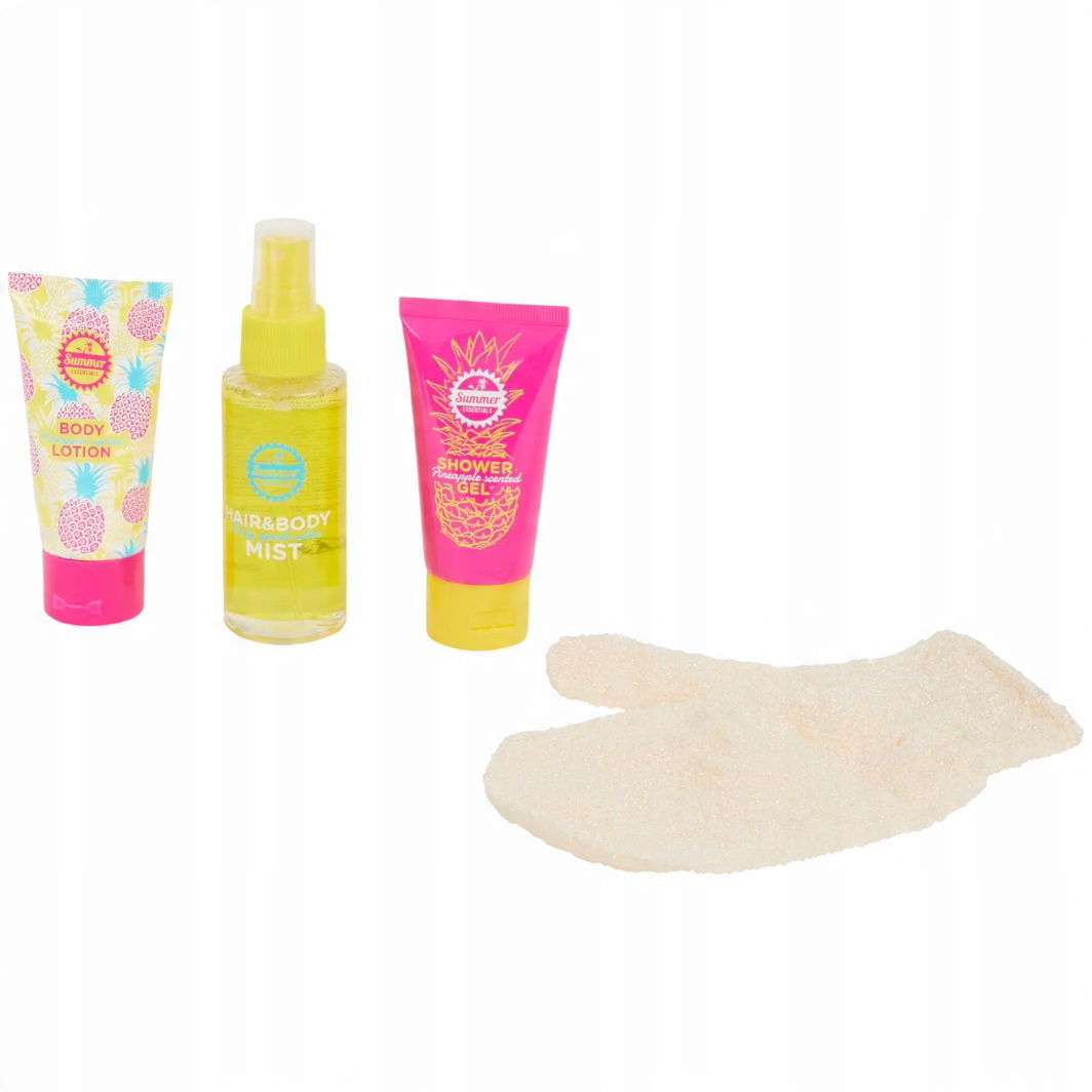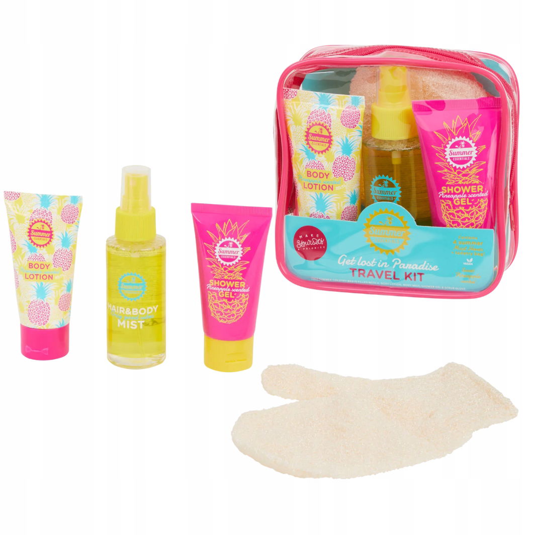 Zestaw składa się z poręcznego etui, rękawicy do peelingu, balsamu do ciała, żelu pod prysznic oraz mgiełki ciała.