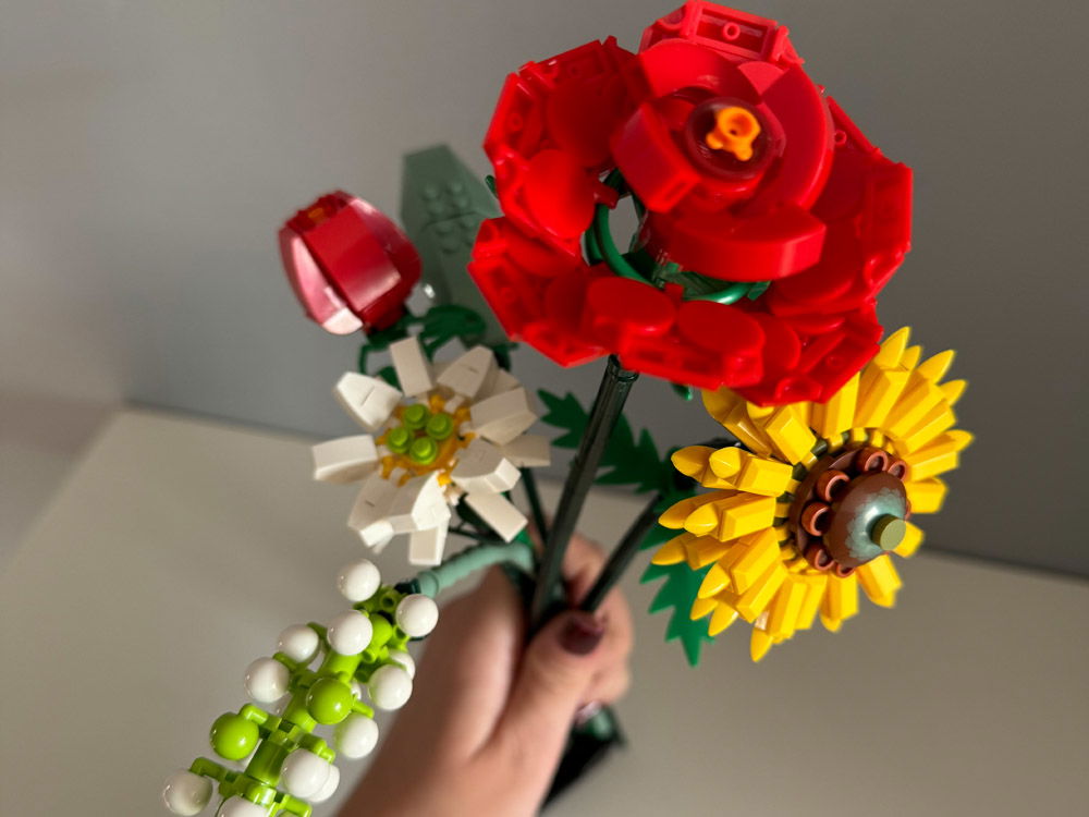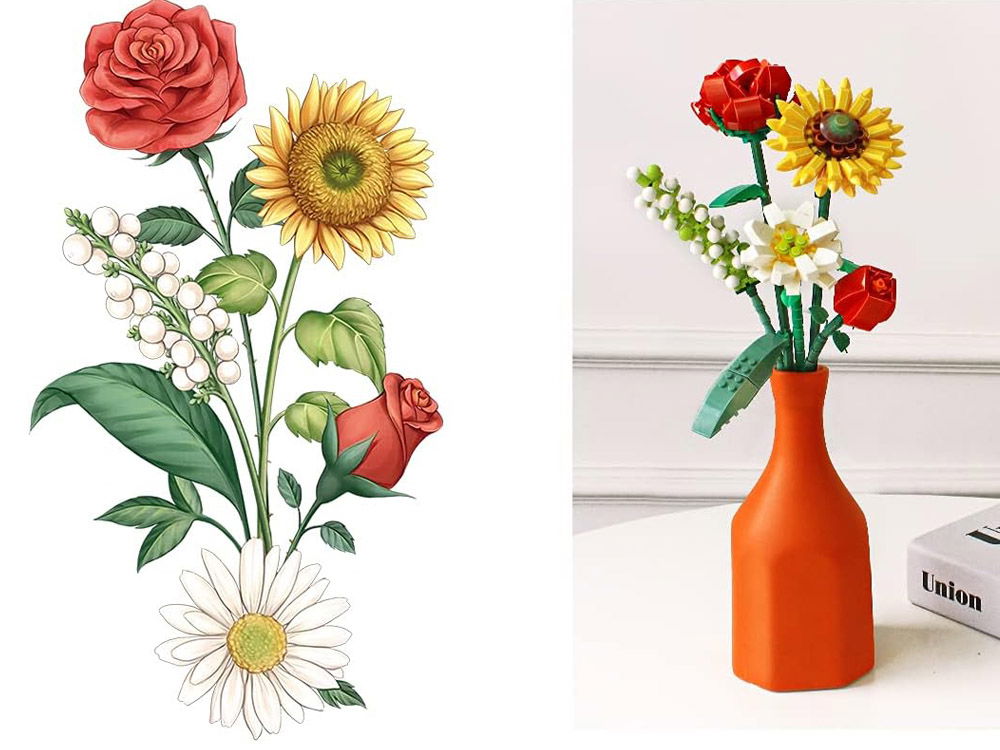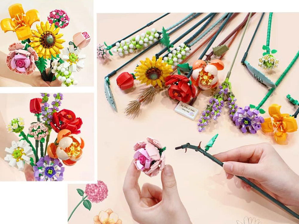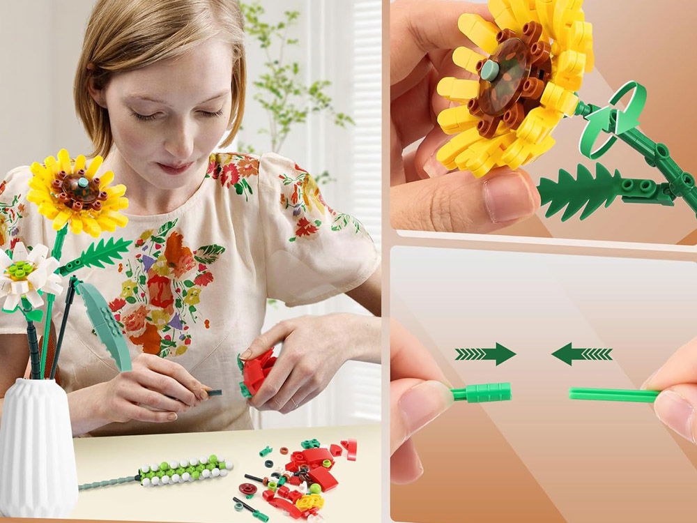 Zestaw zawiera łatwe instrukcje, które ułatwią ci składanie bukietu o długości około 31,5 cm. To nie tylko doskonała rozrywka, ale także sposób na rozwijanie koordynacji, kreatywności oraz umiejętności rozwiązywania problemów. Przy składaniu możesz wybrać spośród różnorodnych kwiatów, takich jak czerwona róża, miłorząb czy słonecznik, każdy z własnym wyjątkowym znaczeniem.