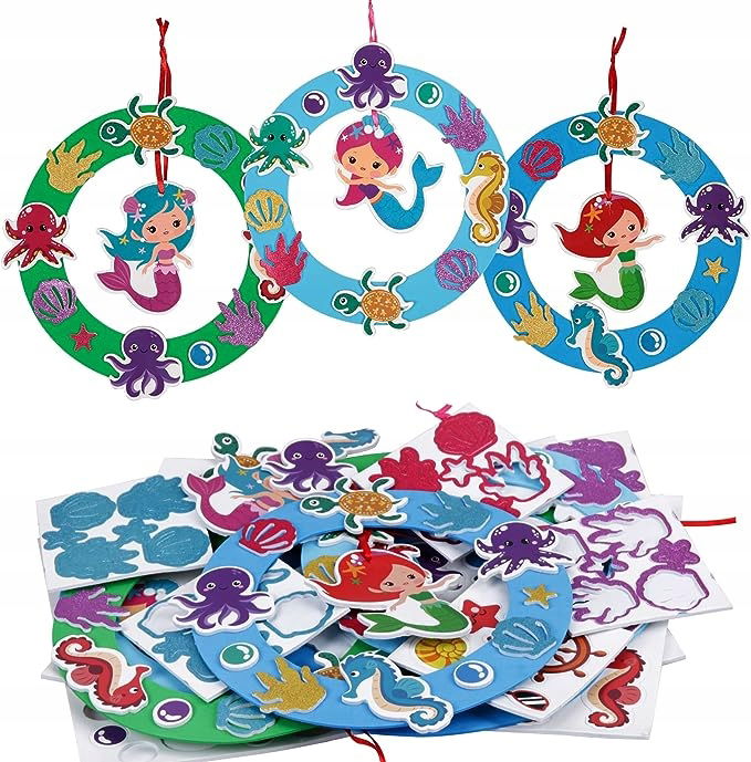 Zestaw wieńców dekoracyjnych syrena: Zestaw wieńców syreny zawiera 6 okrągłych szablonów z gumy piankowej, samoprzylepne akcesoria piankowe i kolorowe wstążki. Syreny, żółwie, koniki morskie, muszle, glony i inne samoprzylepne naklejki piankowe z motywami ułatwią wykonanie wianków syreny.