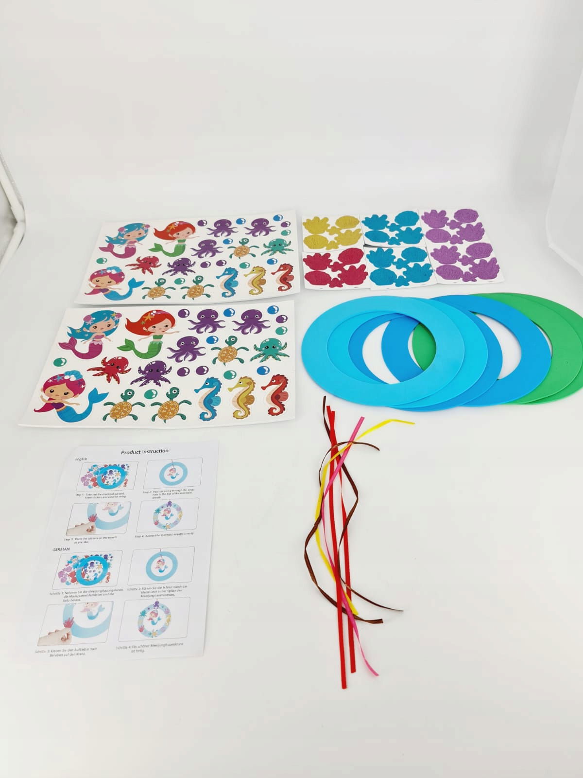 Wielokolorowy wianek piankowy: Wieńce są wykonane z gumy piankowej i dostępnych jest kilka szablonów kolorów, których można użyć. Ręcznie robione girlandy syreny nadają się do spędzenia przyjemnego czasu wolnego z Tobą i Twoimi dziećmi.