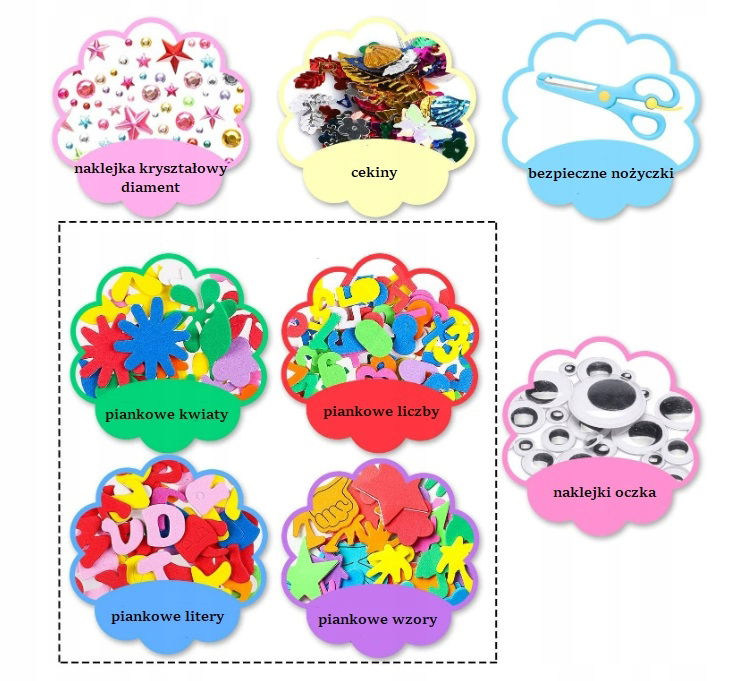 Tworzenie wieńców : Dzieci wykorzystują swoją wyobraźnię do tworzenia unikalnych dekoracyjnych wieńców. Samoprzylepna pianka została zaprojektowana tak, aby umożliwić dzieciom łatwe odklejenie ozdobnych akcesoriów z nosidełka i przymocowanie ich do piankowego szablonu.