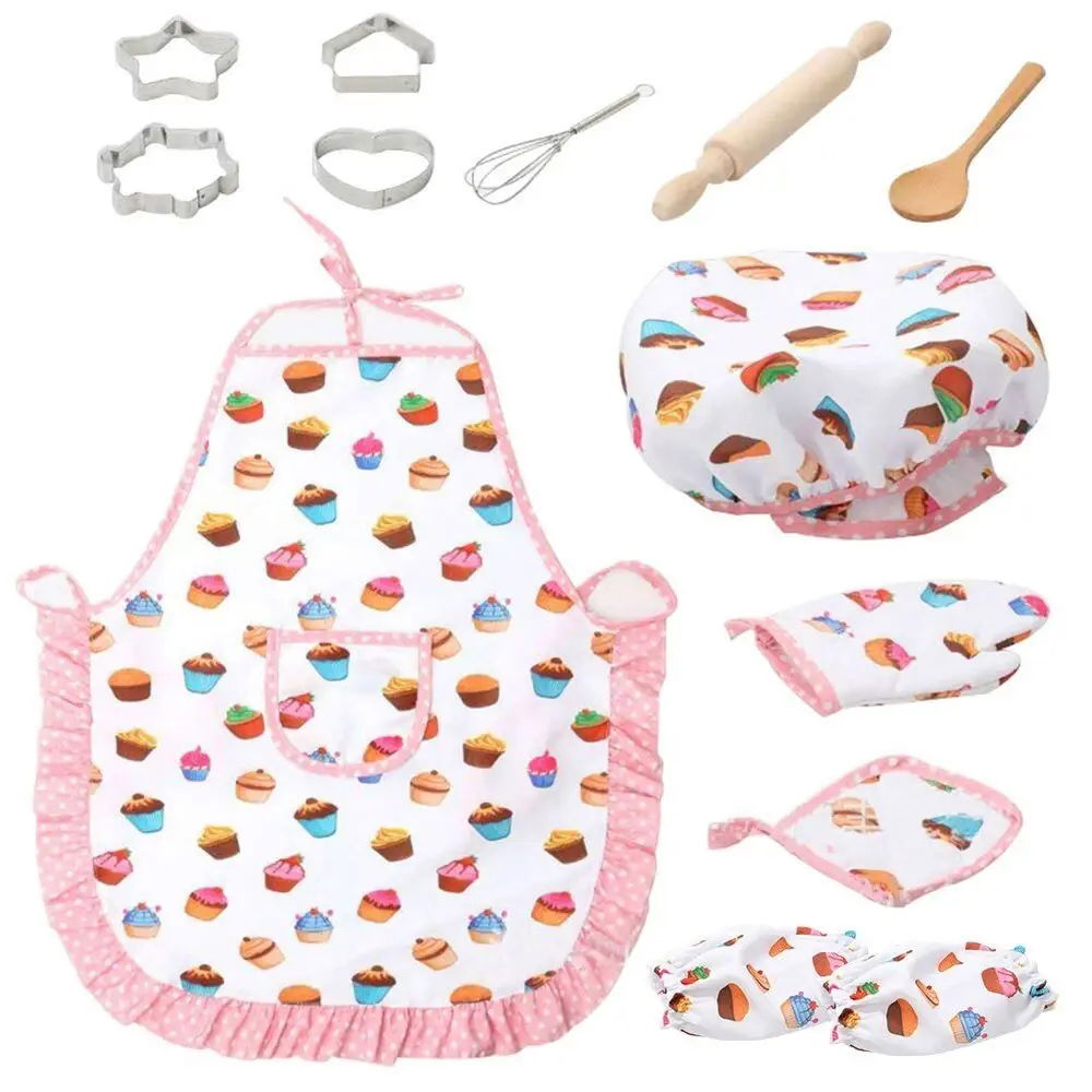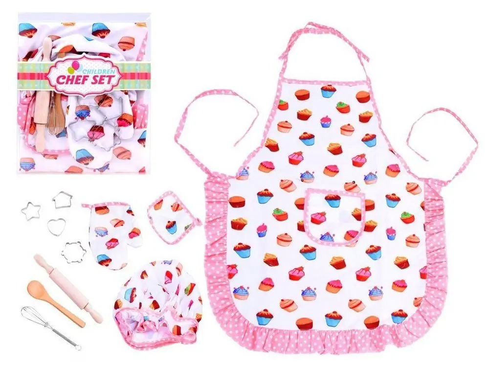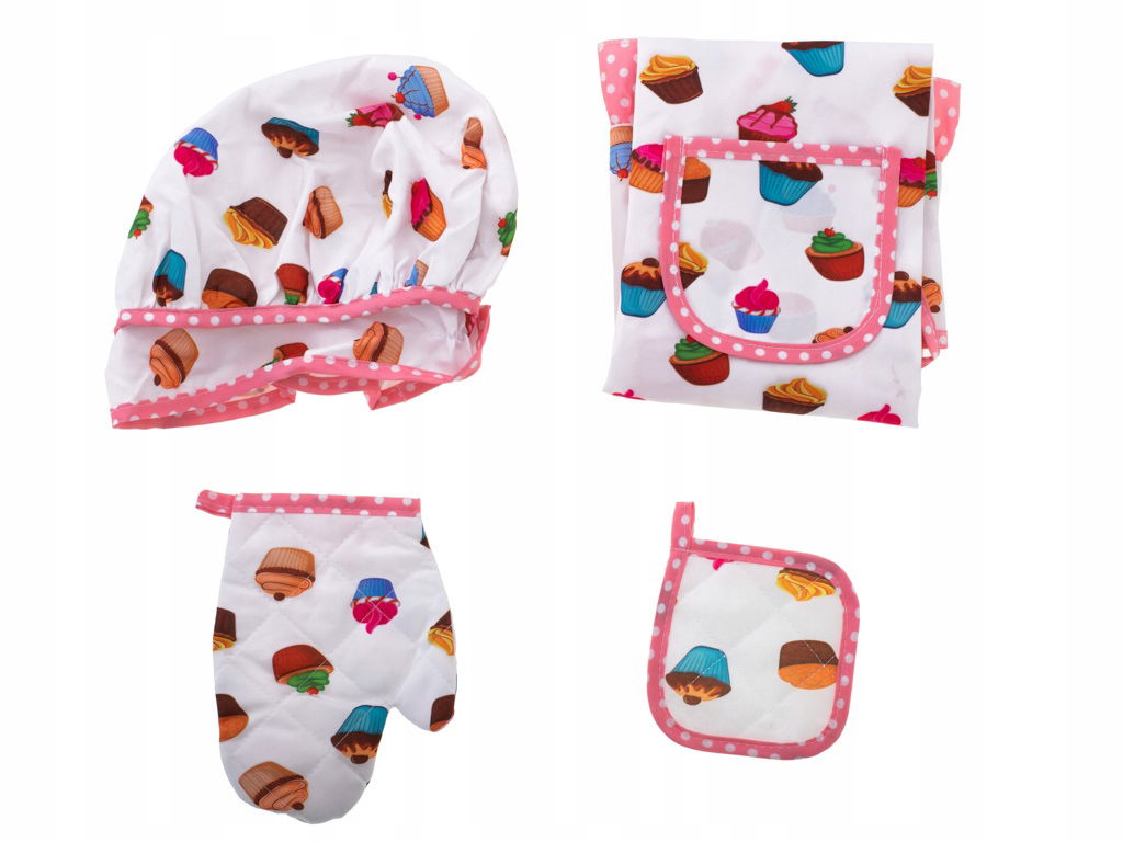 ✔️ W zestawie znajdują się akcesoria – fartuch, rękawica kuchenna, czapka i podkładka pod gorące naczynia – w kolorowe babeczki, które zdecydowanie mogą narobić apetytu. A sama czapka pozwoli poczuć się jak prawdziwy szef kuchni.
