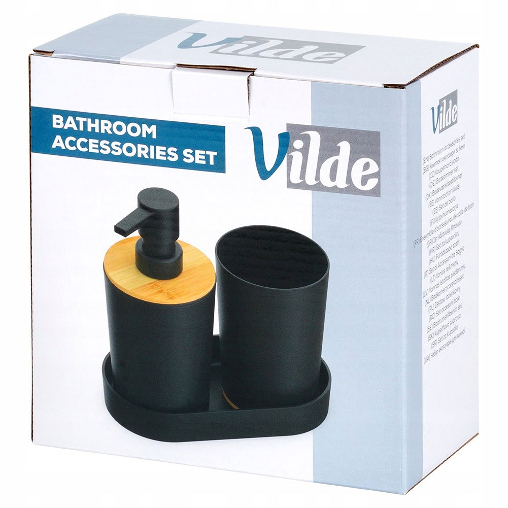 Komplet akcesoriów łazienkowych. W zestawie: 1x dozownik na mydło (8 x 8 x 17 cm, pojemność 380 ml), 1x kubek na przybory (8 x 8 x 11,5 cm, pojemność 400 ml), 1x podstawka (16,5 x 8,5 cm). Przydatne w każdym domu. Solidnie wykonane będą stanowić wyjątkowy element dekoracyjny. Akcesoria prezentują się bardzo elegancko i są utrzymane w modnej kolorystyce. Klasyczny kształt sprawia, że pasują do każdego wnętrza. Oryginalny produkt marki Vilde. Wyprodukowano zgodnie z europejskimi standardami.