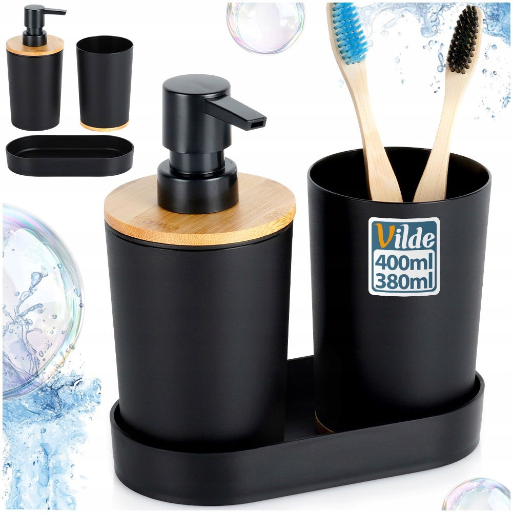 Praktyczny zestaw łazienkowy - Zestaw akcesoriów łazienkowych, składający się z: dozownika na mydło, kubka na przybory np. szczoteczki lub pastę oraz podstawki. Zestaw ustawiony na podstawce ma wymiary 16,5 x 8,5 x 17,5 cm. Solidnie wykonany - Wykonany z najwyższej jakości tworzywa w czarnym, matowym kolorze. Dodatkowe elementy wykonane z drewna bambusowego. Przydatny w każdej łazience - Ułatwia organizację przestrzeni wokół umywalki, umożliwiając wygodne przechowywanie szczoteczek i mydła. Praktyczne rozwiązanie, które pomaga utrzymać porządek. Funkcjonalny i kompaktowy - Wszystkie elementy umieszczone są na podstawce, co pozwala zachować porządek na umywalce i zaoszczędzić miejsce. Stylowy dodatek do łazienki - Nowoczesne połączenie czerni z naturalnym drewnem bambusowym sprawia, że zestaw będzie estetycznym i praktycznym elementem wyposażenia każdej łazienki.