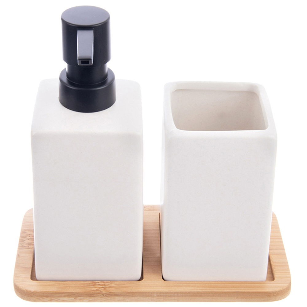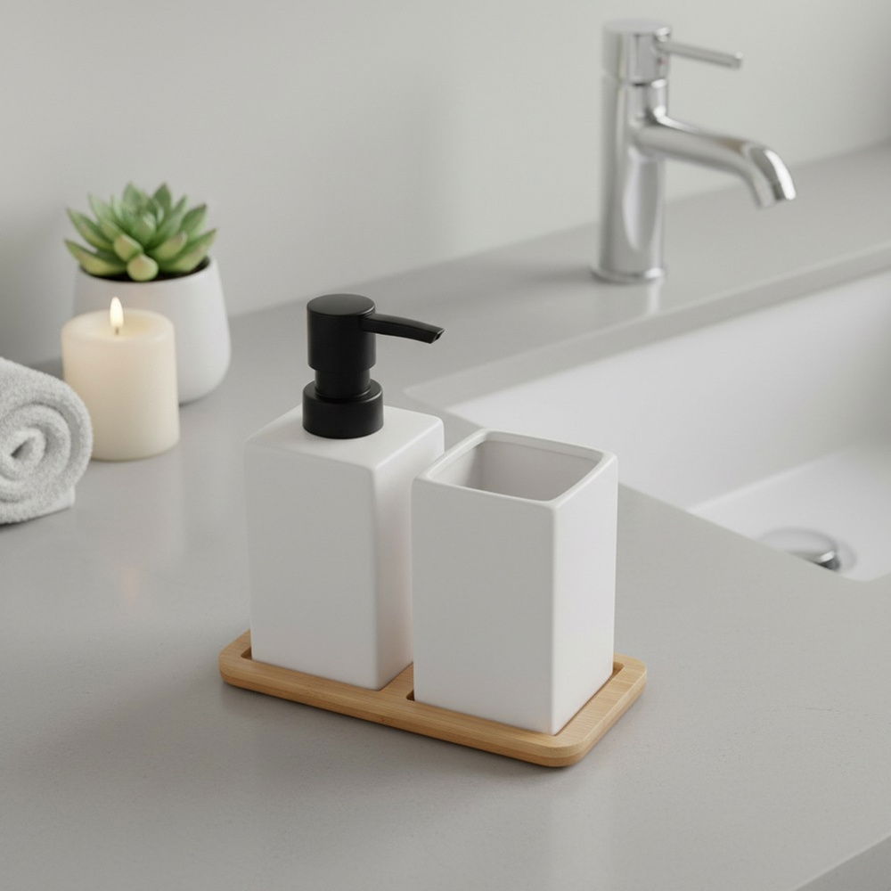 Solidnie wykonany - Elementy zestawu wykonane są z wysokiej jakości dolomitu w białym kolorze. Tacka z naturalnego drewna bambusowego stanowi dekoracyjny akcent i stabilną podstawę dla akcesoriów.
