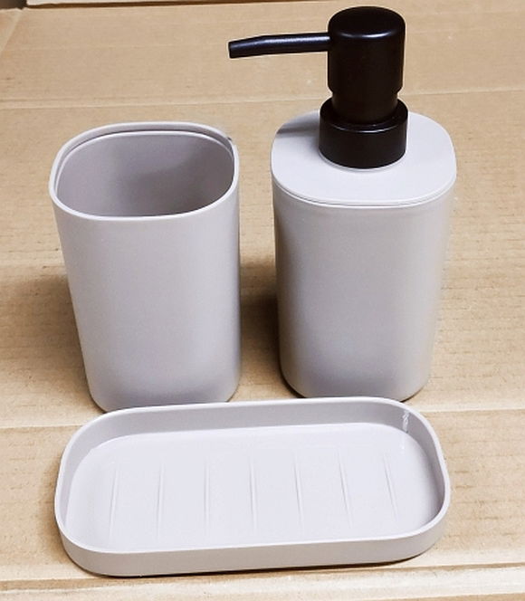 Zestaw łazienkowy: kubek, dozownik do mydła i mydelniczka. Z tworzywa sztucznego. Kolor taupe.