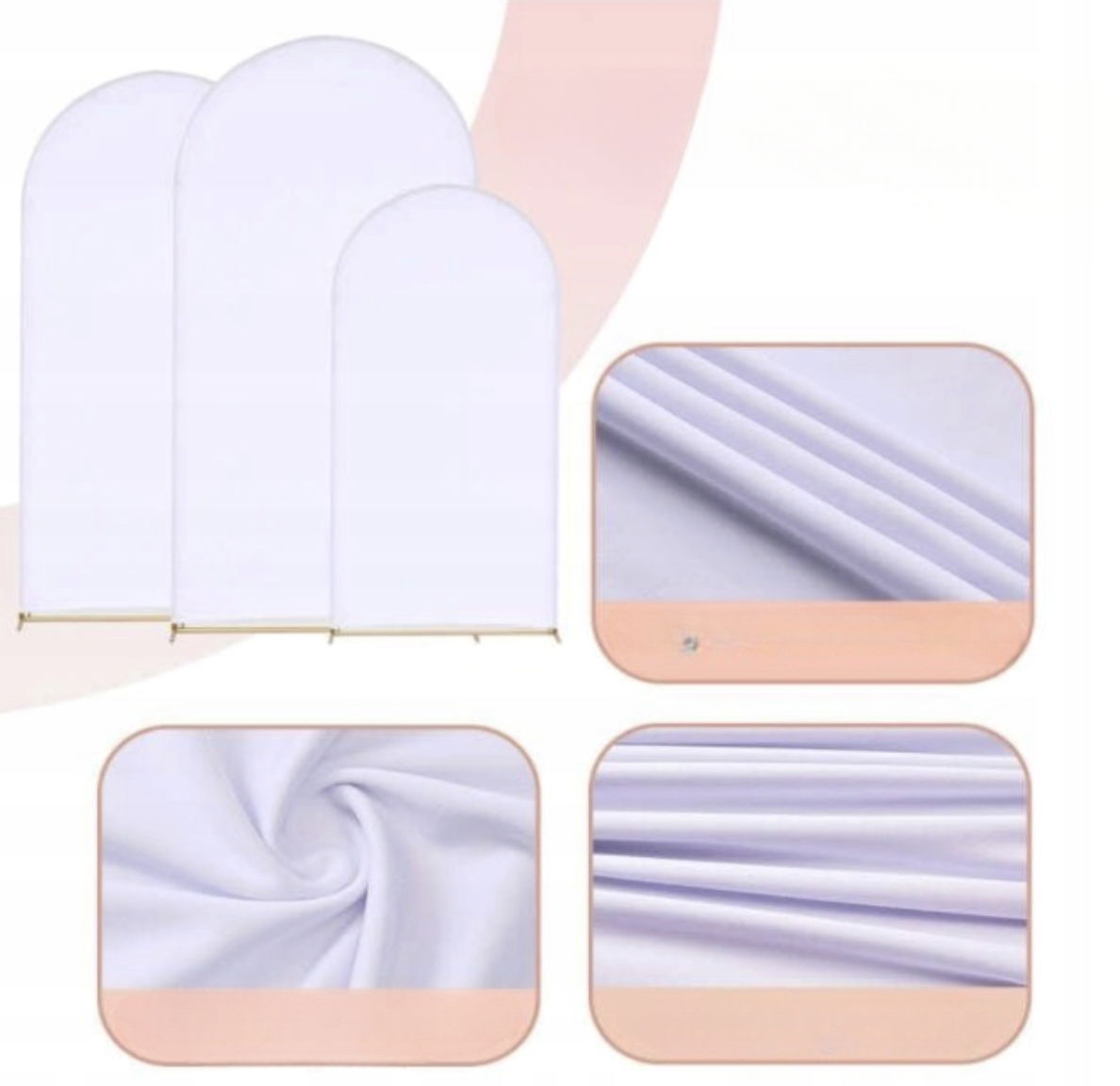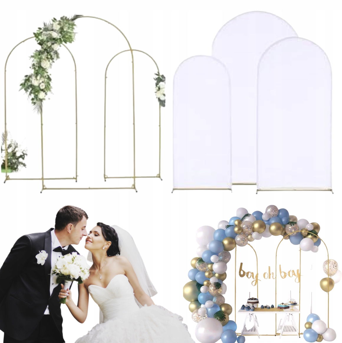 Zawiera 3 metalowe stojaki w kształcie łuku oraz 3 elastyczne białe pokrowce z spandexu, które dopasowują się idealnie do konstrukcji, dodając uroku każdej ceremonii i przyjęciu. Zestaw łączy trwałość metalu z estetyką materiału, tworząc efektowną dekorację zarówno wewnątrz, jak i na zewnątrz.