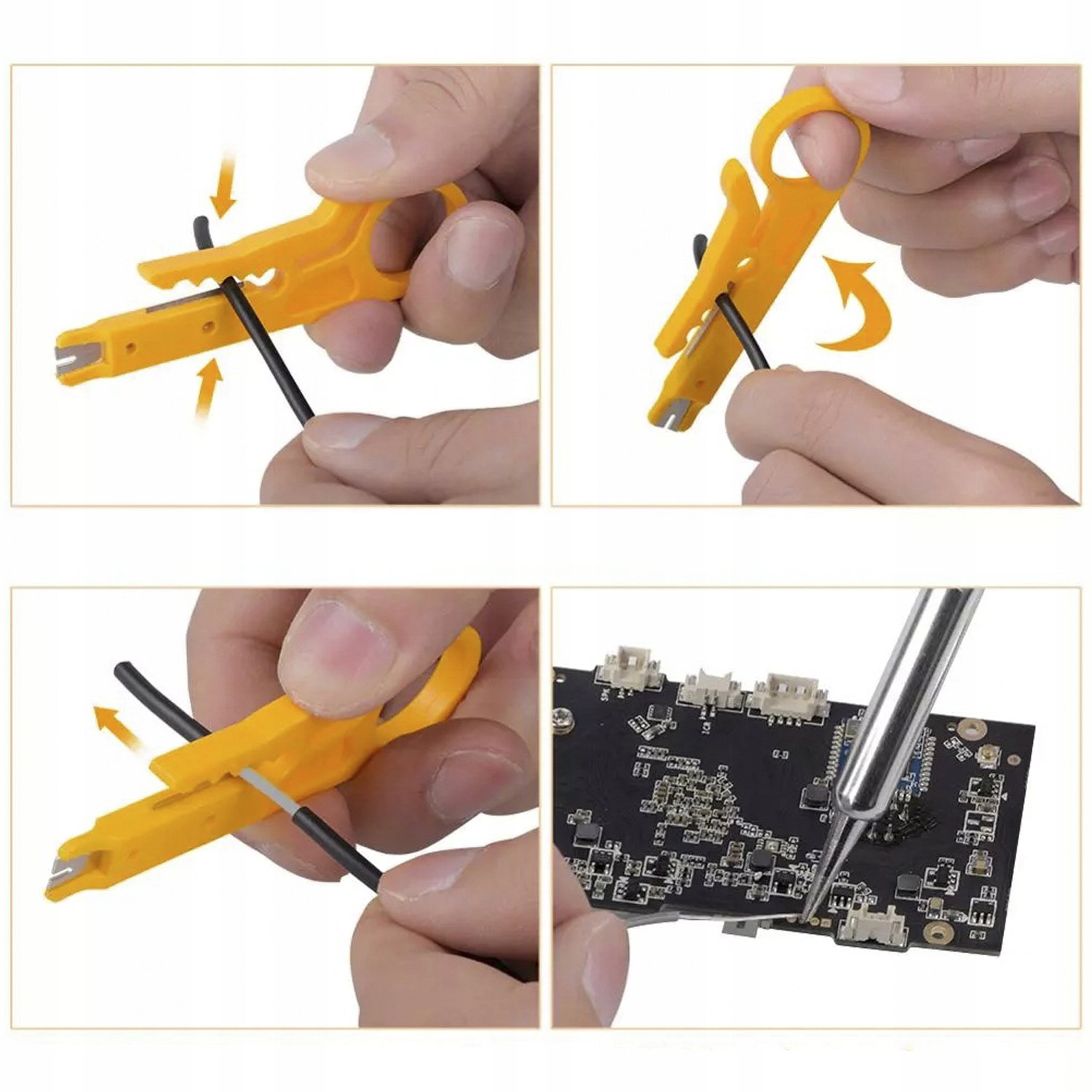- Ściągacz izolacji, odsysacz, pęseta i podstawka pod lutownicę dołączone do zestawu usprawnią pracę