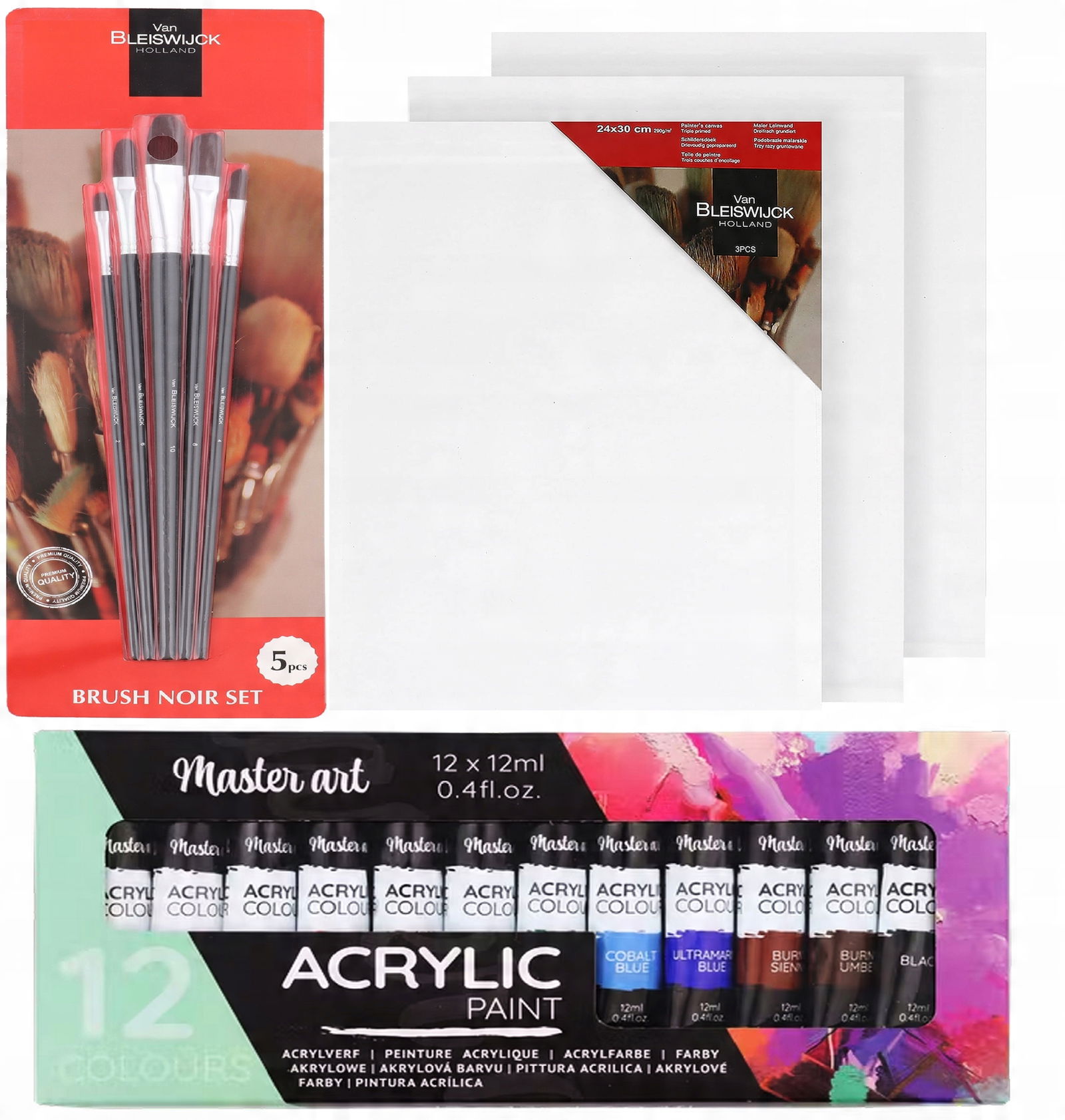 ZESTAW MALARSKI 20w1: 3 PŁÓTNA 5 PĘDZLI 12 FARB AKWARELOWYCH VAN BLEISWIJCK