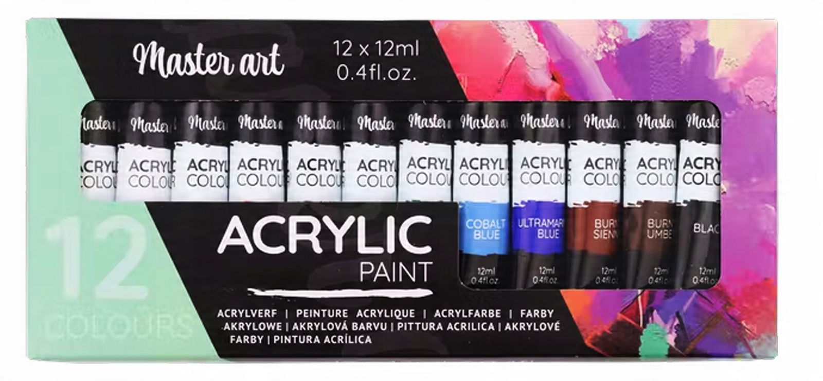 - 12 tubek farb, każda o pojemności 12ml.
