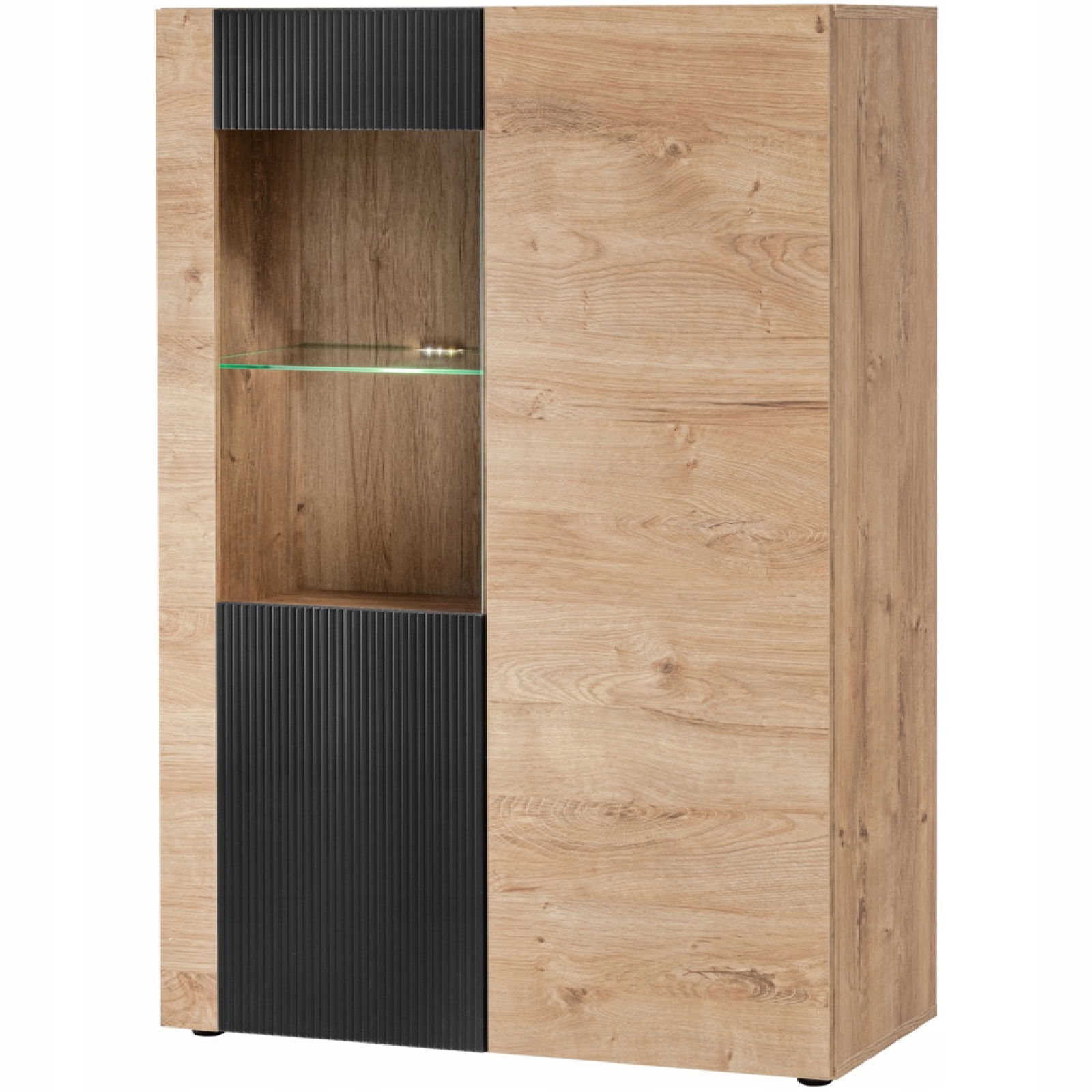 Wprowadź do swojego salonu elegancję, harmonię i nowoczesny styl z kolekcją mebli ARON. Połączenie naturalnej barwy dębu ribbeck z nowoczesnymi, czarnymi panelami o ryflowanej strukturze tworzy efektowny, a zarazem przytulny klimat wnętrza. Przeszklone witryny z oświetleniem LED zapewniają wyjątkową prezentację dekoracji i dodatków, a opcjonalny biokominek w szafce RTV doda ciepła i atmosfery.