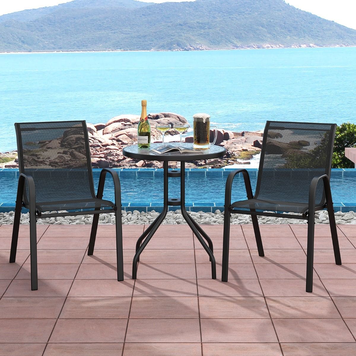 Stylowy 3-częściowy zestaw mebli ogrodowych to idealne połączenie komfortu i elegancji. W skład kompletu wchodzą 2 wygodne krzesła z podłokietnikami oraz stolik ze szkłem hartowanym, które tworzą przytulne miejsce na poranną kawę, wieczorny relaks czy spotkania z bliskimi.