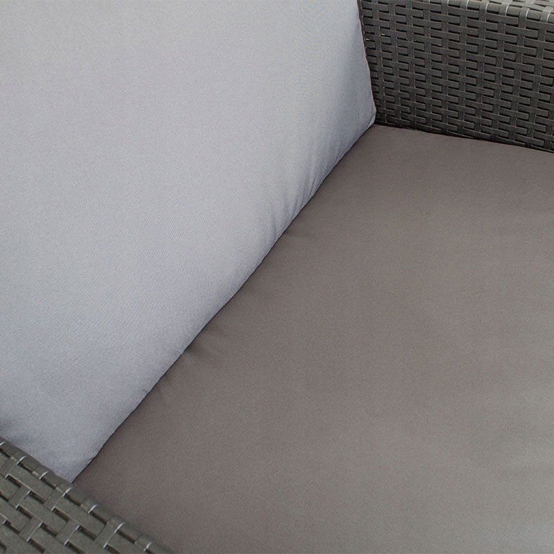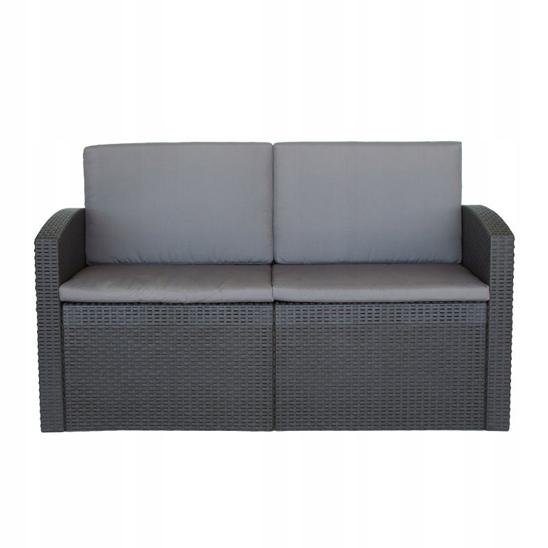4-częściowy zestaw mebli ogrodowych składa się z dwuosobowej sofy, dwóch wygodnych foteli z poduszkami oraz stolika ze szklanym blatem.