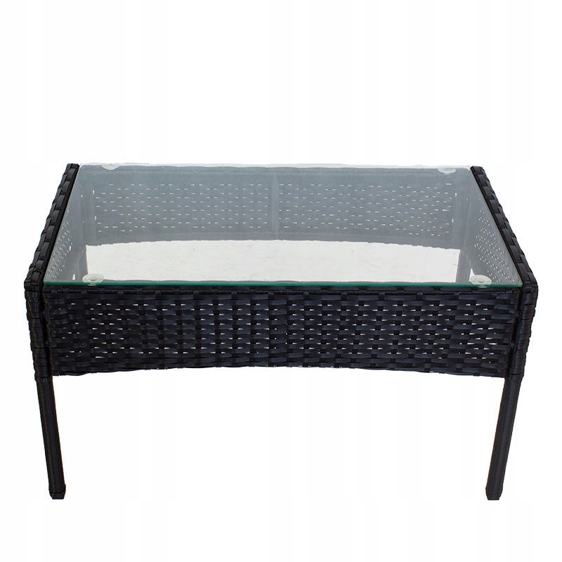 - Materiał: stalowa konstrukcja malowana proszkowo, technorattan, szkło hartowane (blat stolika)