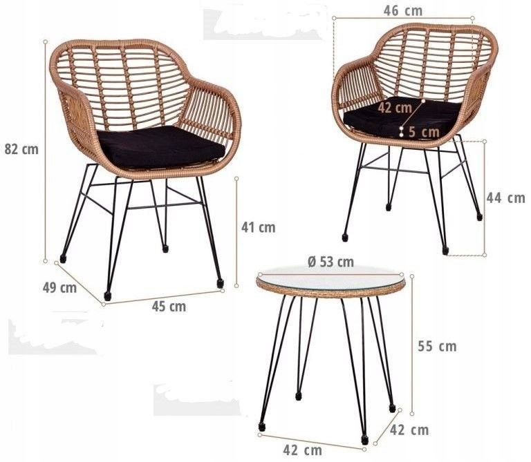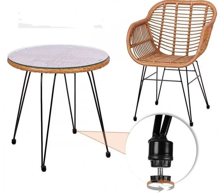 Nasz zestaw balkonowy w stylu rattanu nadaje się zarówno do użytku wewnątrz, jak i na zewnątrz. Krzewsła o ergonomicznym kształcie z siedziskami o grubości 5 cm zapewniają wysoki komfort siedzenia. Dzięki regulowanym śrubom poziomującym na nogach krzeseł i stołu bardzo łatwo zniwelować nierówności podłoża.