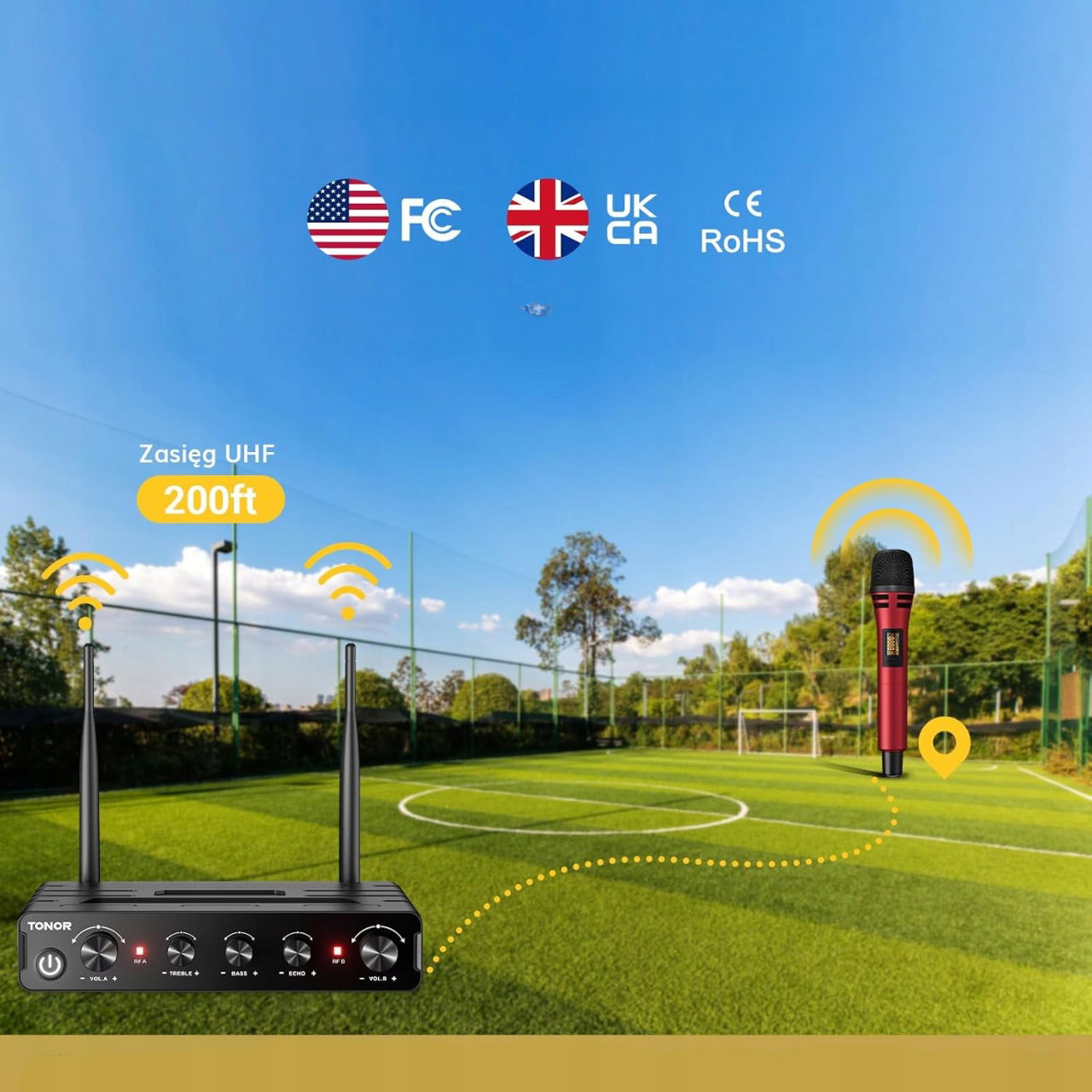 Dzięki zasięgowi działania do 200 stóp możesz swobodnie poruszać się po scenie, nie martwiąc się o zakłócenia lub przerwy w transmisji. To idealne rozwiązanie, jeśli lubisz dynamiczne występy i chcesz mieć pełną swobodę podczas prezentacji lub zabawy karaoke. Bezprzewodowy system mikrofonów TONOR TW350 sprawdzi się zarówno w przestrzeniach zamkniętych, jak i na świeżym powietrzu. Wystarczy, że włączysz mikrofony i odbiornik, a urządzenia automatycznie się zsynchronizują, umożliwiając Ci natychmiastowe rozpoczęcie pracy. Teraz możesz skupić się wyłącznie na emocjach i energii Twojego występu.