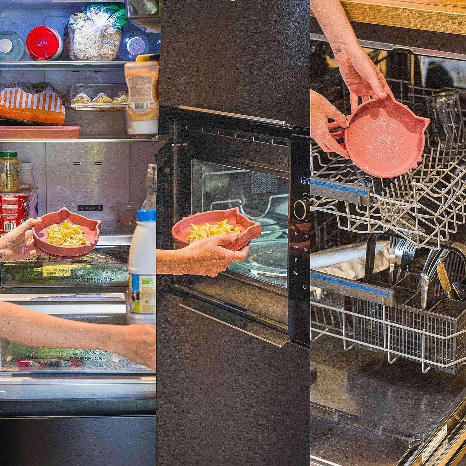 Silikonowe naczynia są łatwe w utrzymaniu czystości, wodoodporne i odporne na zapachy. Nadają się do mycia w zmywarce oraz podgrzewania w kuchence mikrofalowej, co zapewnia wygodę użytkowania.