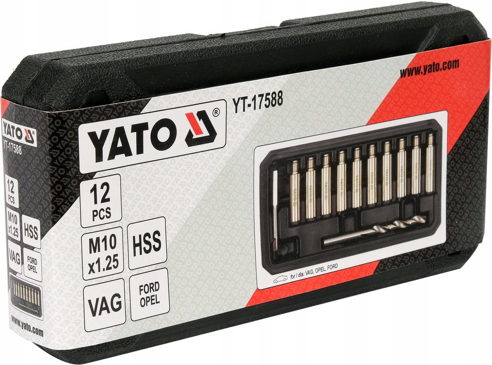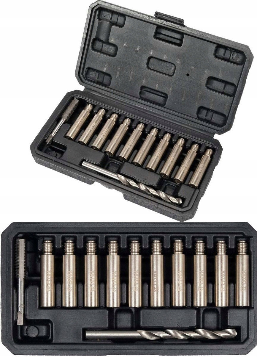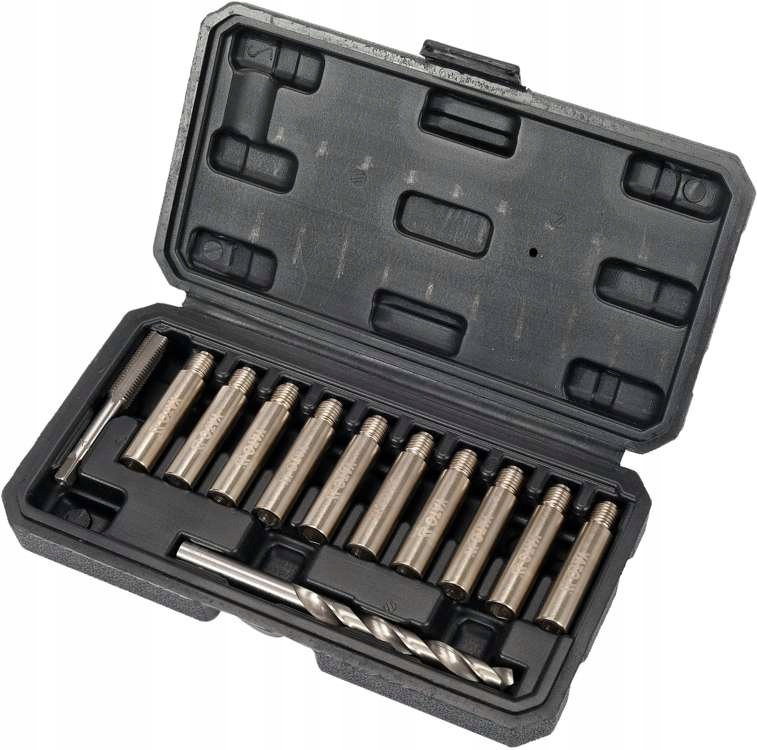 zawartość zestawu: wiertło (Ø8.8 mm), gwintownik M10x1.25 mm, prowadnica z nadwymiarowym gwintem x10 (gwint M10x1.25 mm, Ø12 mm, L=42 mm)
