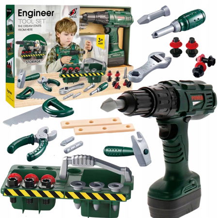 Zestaw dla dziecka zawiera wiele różnych narzędzi, takich jak wiertarko-wkrętarka na baterie, piła, młotek i wiele innych. Dzięki temu dziecko może naśladować dorosłych i uczyć się podstawowych umiejętności naprawczych i konstrukcyjnych. Narzędzia przechowywane są w praktycznej skrzynce, co ułatwia nie tylko przechowywanie, ale także zabieranie go wszędzie, gdzie dziecko zechce.
