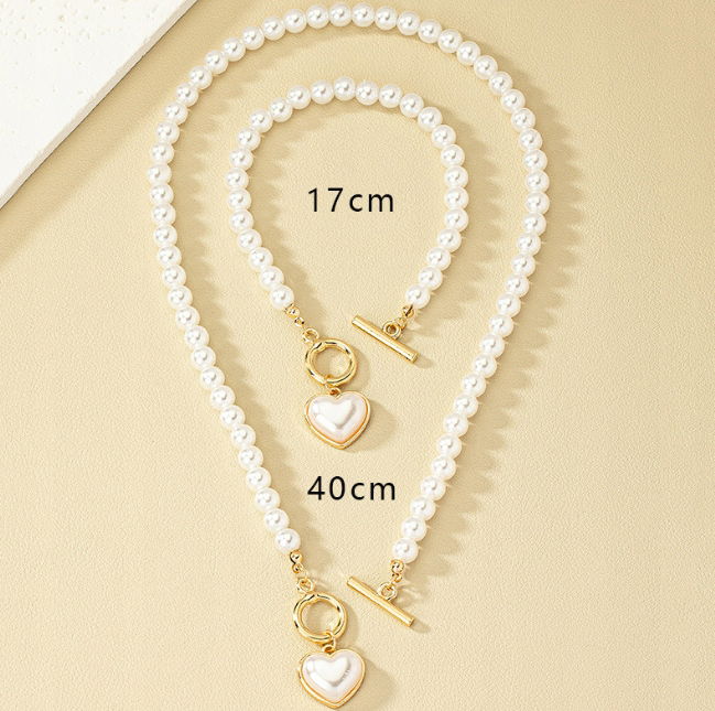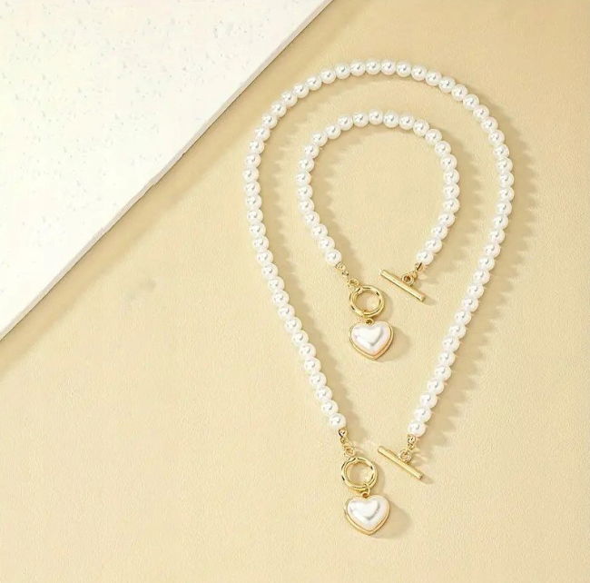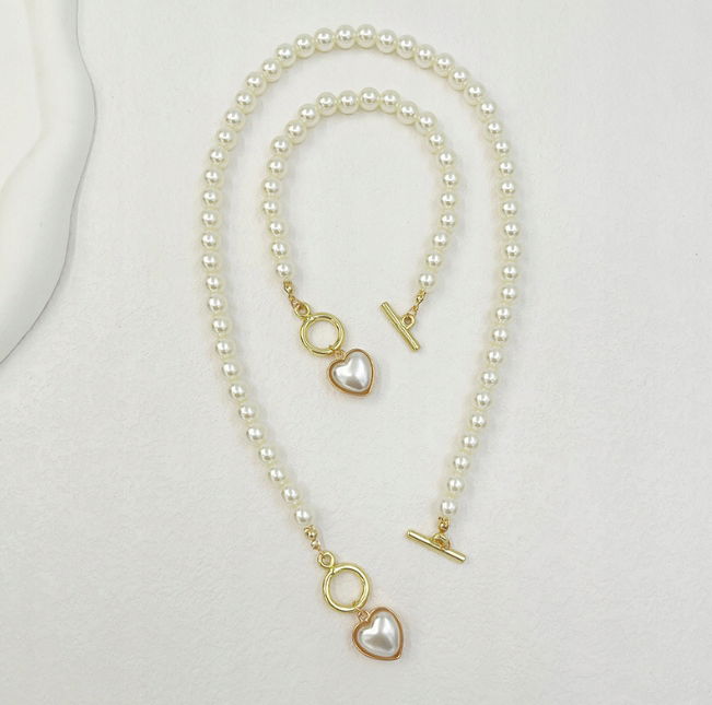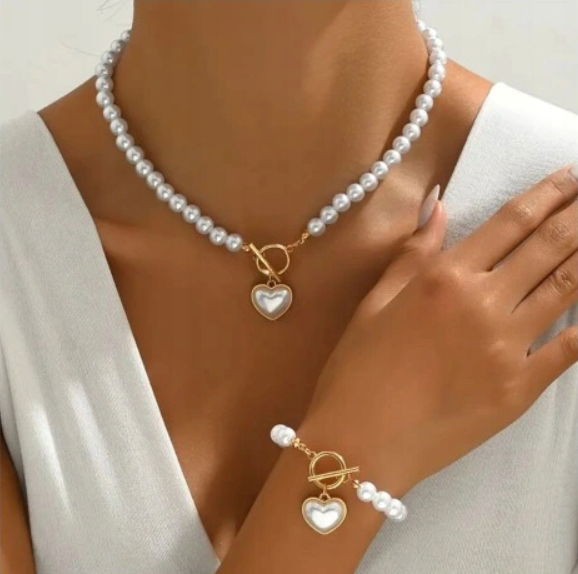 Zestaw Naszyjnik Bransoletka Perły Kolor Złoty Biały Klasyczny Serce Choker
