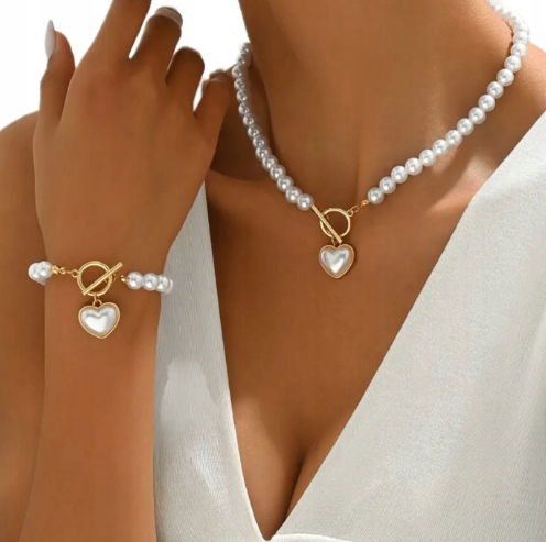 Komplet Damski Naszyjnik Bransoletka Klasyczny Choker Perły Złoty Serce
