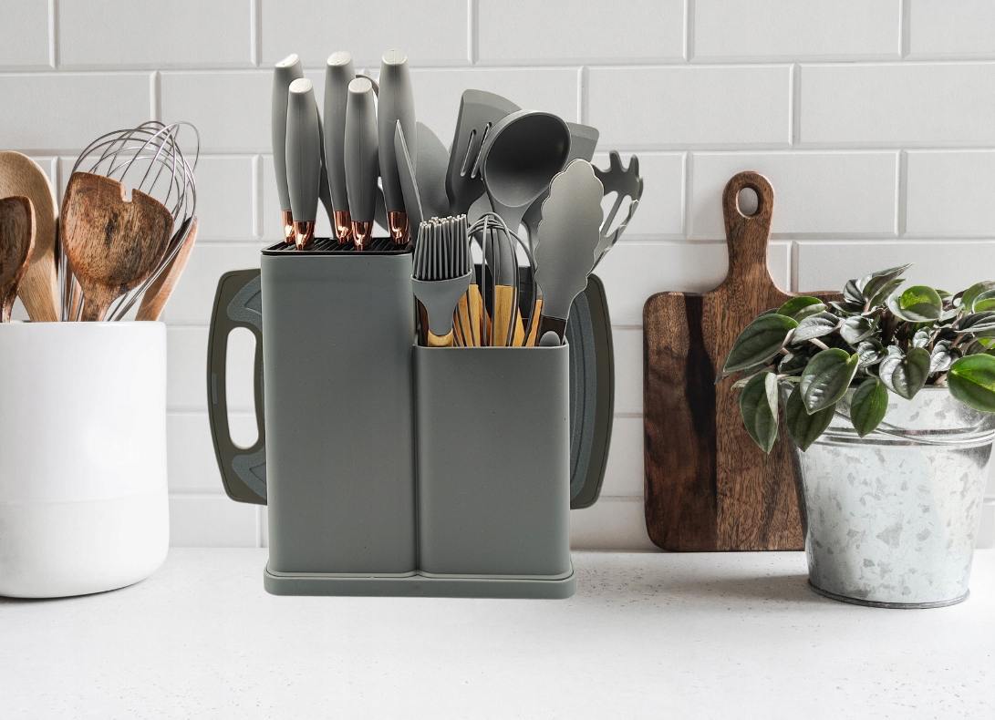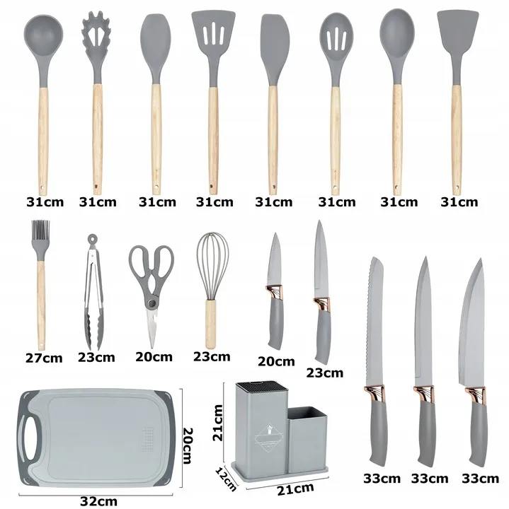 ZESTAW NOŻY I PRZYBORÓW KUCHENNYCH W STOJAKU 19el szary PRZYBORY SILIKONOWE