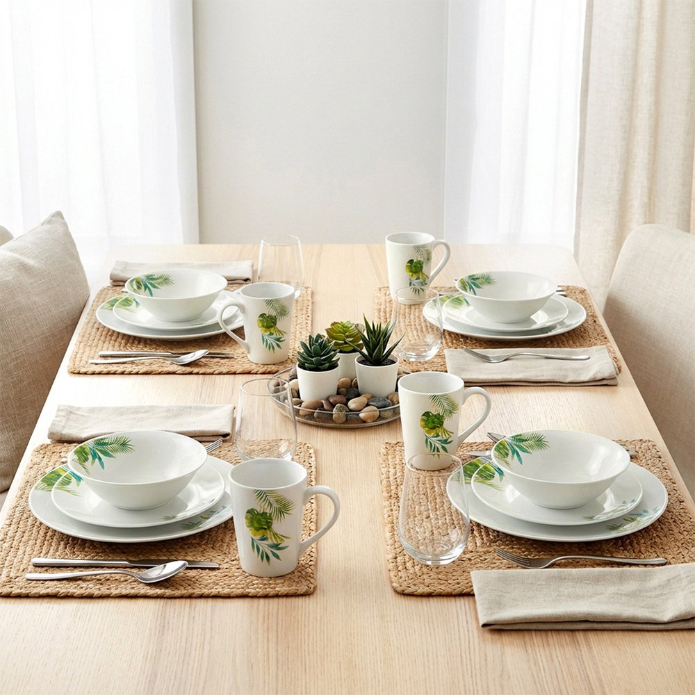 Uniwersalne zastosowanie - Zestaw sprawdzi się w codziennym użytku oraz podczas spotkań z rodziną i gośćmi. Miseczki są doskonałe do zup, sałatek oraz przekąsek. Płytkie talerze obiadowe sprawdzą się do dań głównych, a talerze deserowe do deserów, śniadań i przekąsek. Kubki nadają się zarówno do serwowania kawy, jak i herbaty.