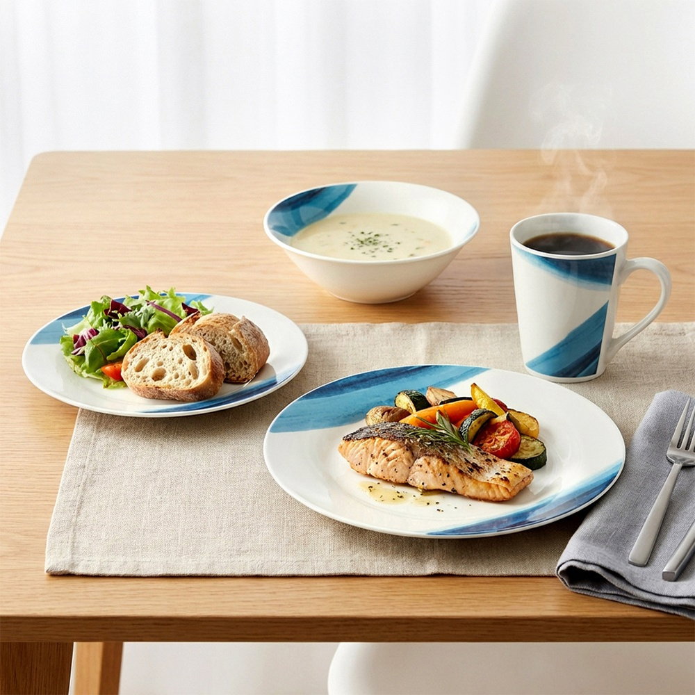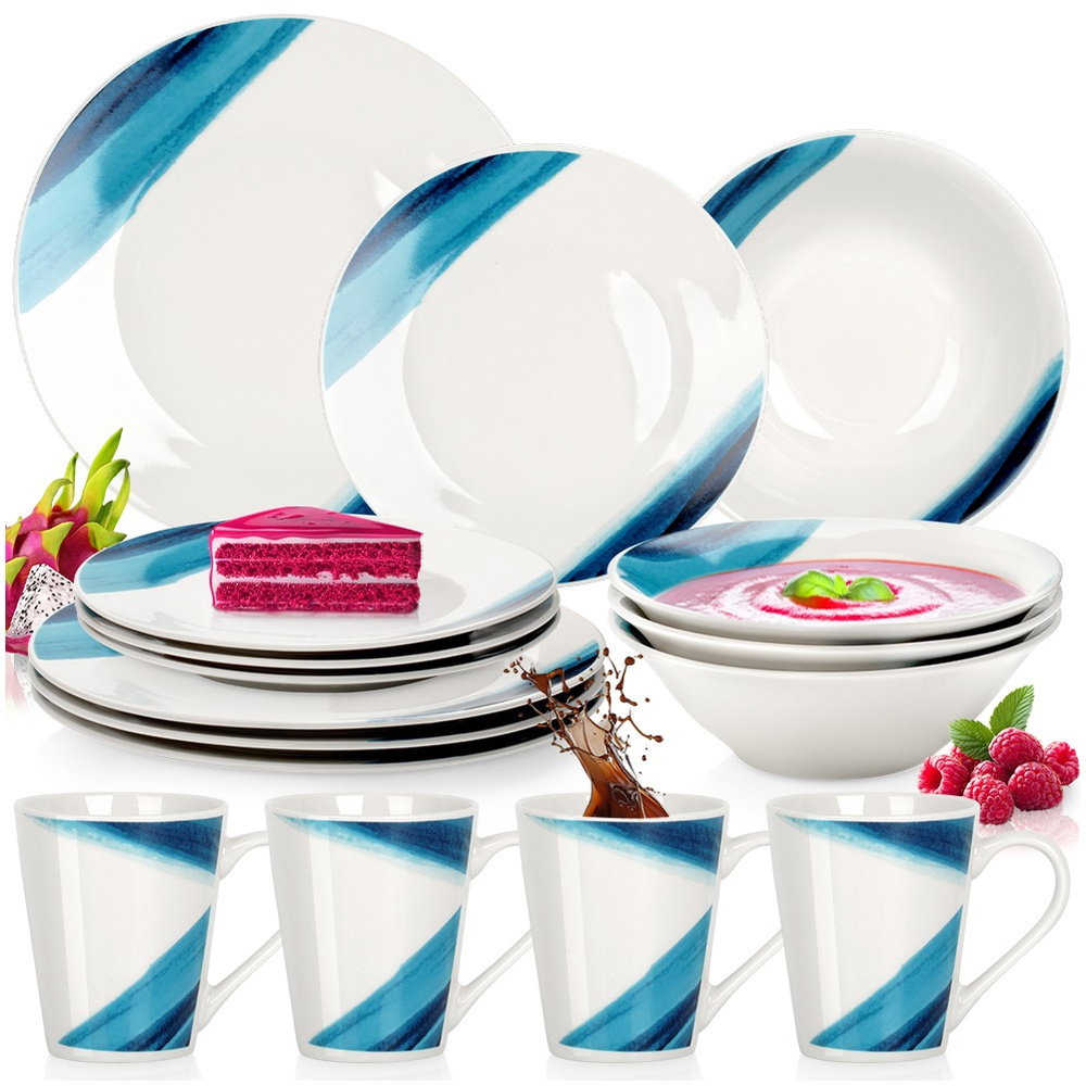 Uniwersalne zastosowanie - Zestaw sprawdzi się w codziennym użytku oraz podczas spotkań z rodziną i gośćmi. Miseczki są doskonałe do zup, sałatek oraz przekąsek. Płytkie talerze obiadowe sprawdzą się do dań głównych, a talerze deserowe do deserów, śniadań i przekąsek. Kubki nadają się zarówno do serwowania kawy, jak i herbaty.