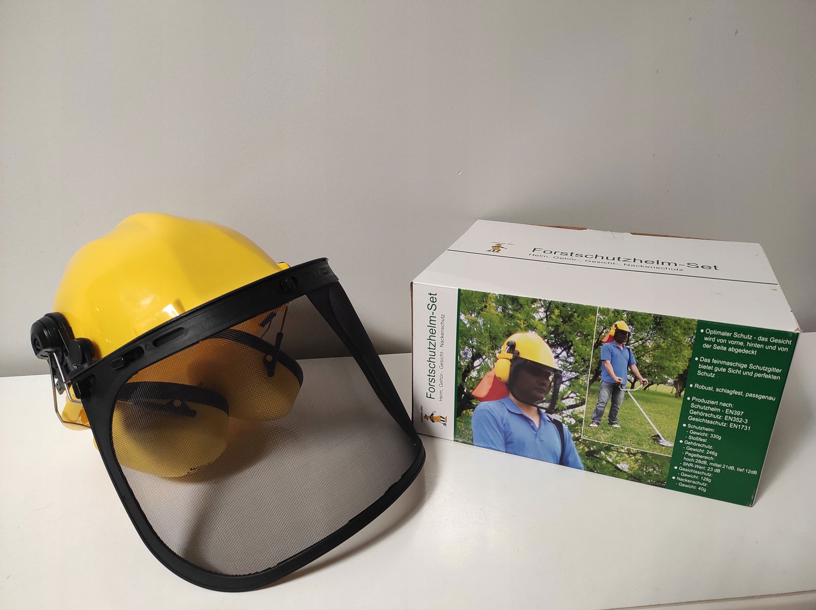 Zestaw ochronny z kaskiem, metalową osłoną twarzy, nausznikami marki oraz peleryną ochronną na kark cenionej niemieckiej marki Thomas Philipps. Kask zabezpiecza twarz, oczy uszy oraz kark podczas prac takich jak koszenie trawy, karczowanie zarośli czy cięcie pilarką spalinową.