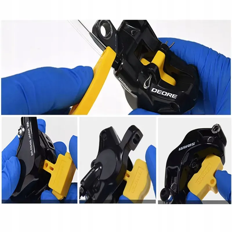 W komplecie znajdują się także bloki tłoczków (2-tłoczkowy, 4-tłoczkowy oraz do hamulców szosowych), które zabezpieczają zacisk podczas serwisu. Dodatkowe narzędzia – klucze imbusowe, klucz Torx, klucz płaski oraz narzędzie do ustawiania zacisku – pozwalają wykonać pełną obsługę hamulców bez konieczności dokupowania innych akcesoriów. Całość tworzy funkcjonalny zestaw do regularnej i bezpiecznej konserwacji hamulców.