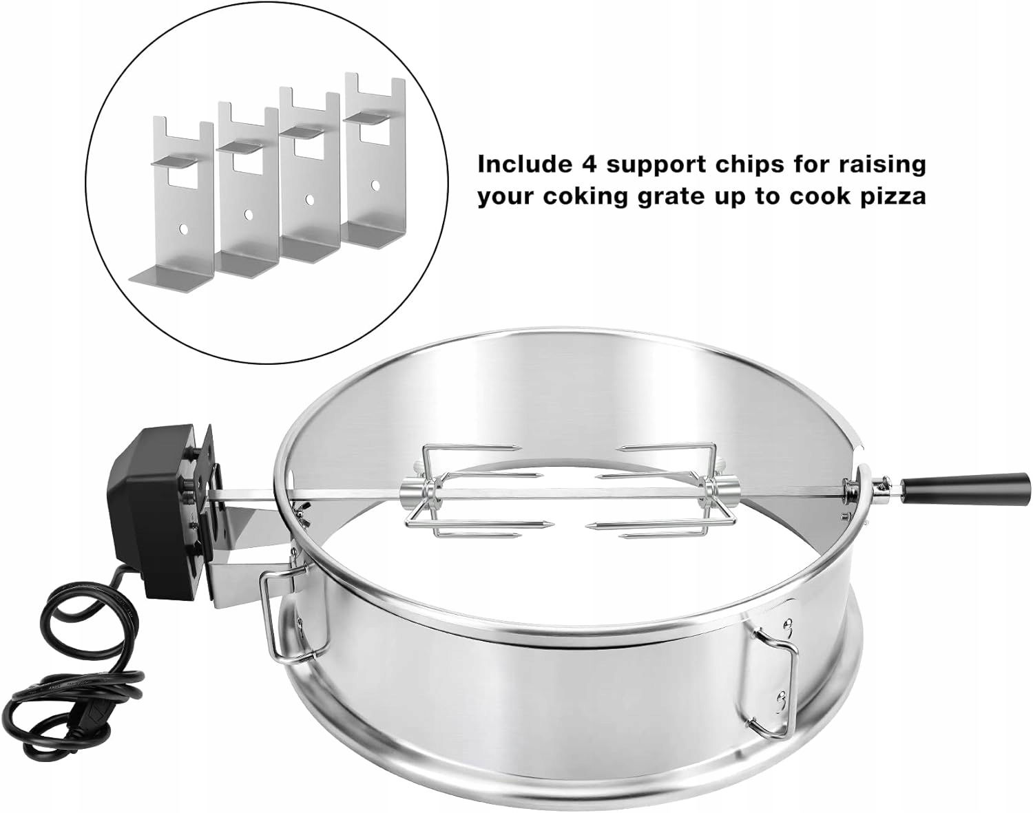 Zestaw do przygotowywania pysznych dań na grillu lub w domowym piecu. Składa się z rożna z silnikiem elektrycznym oraz pierścienia rożna, co pozwala na równomierne opiekanie mięs.