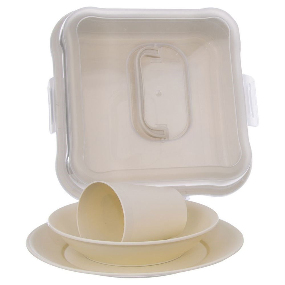 Zestaw piknikowy wykonany z najwyższej jakości tworzywa. Odporny na temperatury od -25°C do +95°C. W zestawie: 4x talerz płytki (średnica 23,5 cm), 4x talerz głęboki (średnica 18,5 cm), 4x kubek (pojemność 300 ml), 1x pojemnik z klipsami (27 x 27 x 12 cm). Świetnie sprawdzi się podczas wyjazdów, pikników oraz wycieczek.