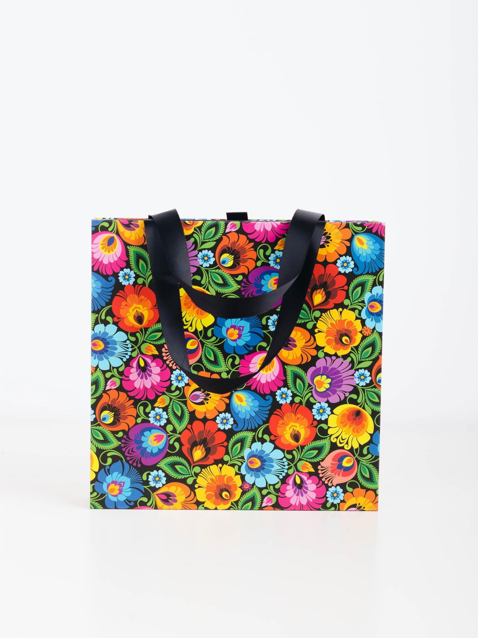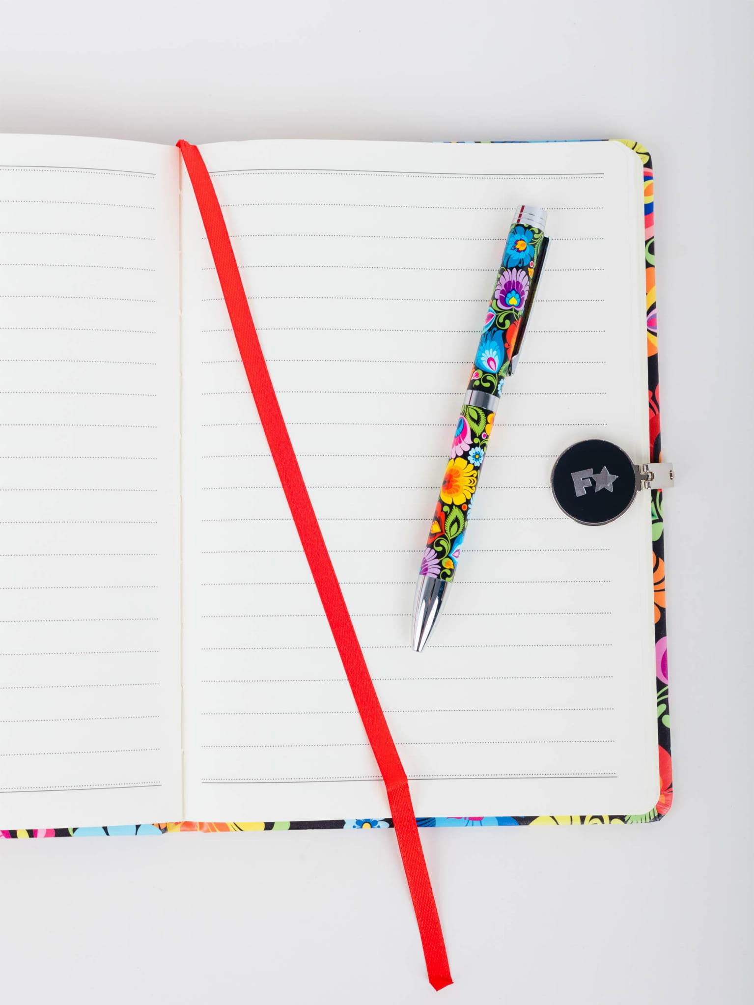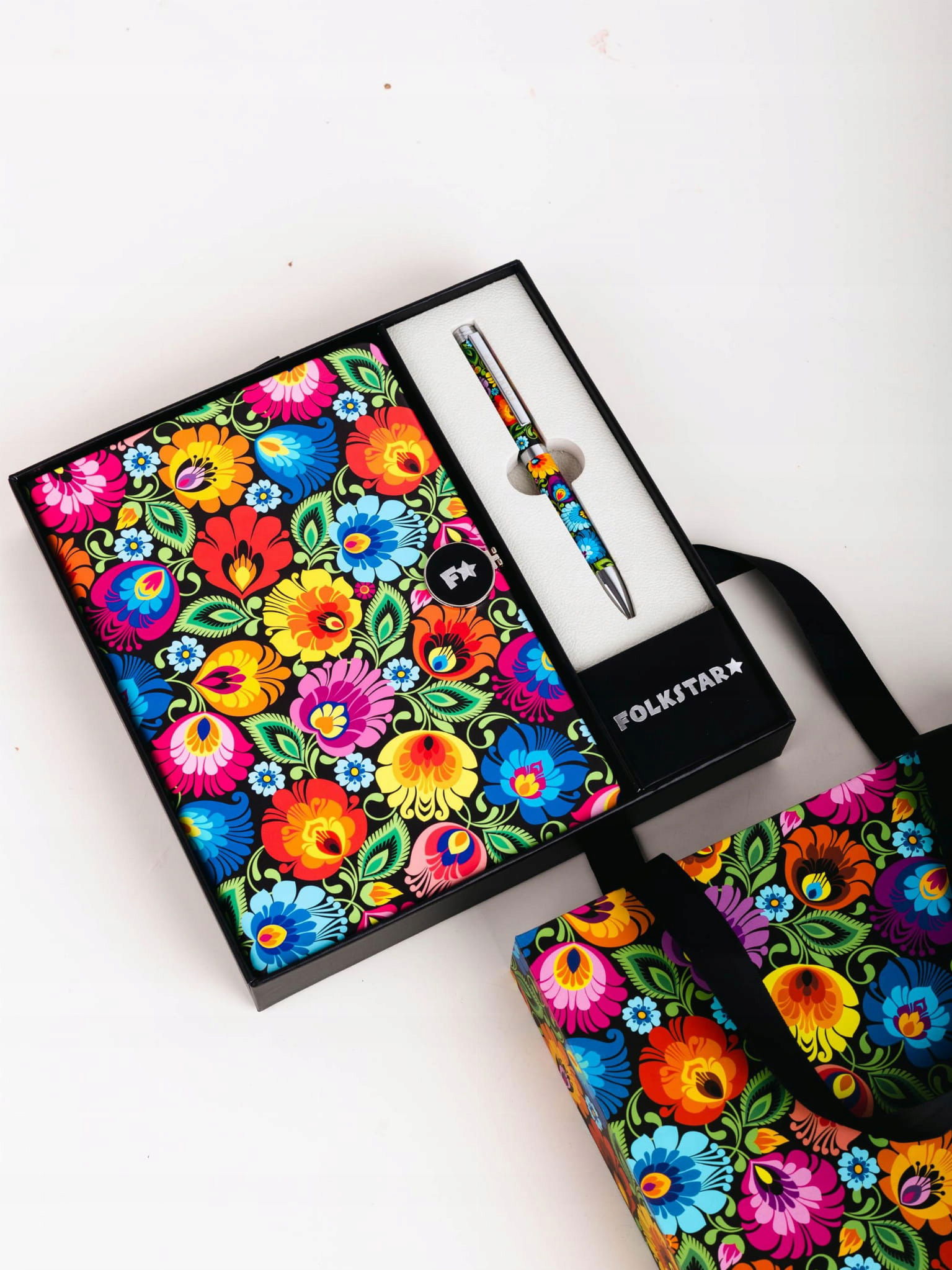 Elegancki zestaw notes+długopis zapakowany w elegancką torebkę prezentową. Inspiracją dla motywów zdobiących przedmioty są wzory kwiatowe z wycinanki łowickiej.
