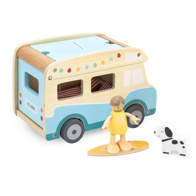 Ruszaj w podróż z plażowym kamperem od Viga! Ten zestaw zawiera wszystko, czego potrzebujesz do udanej wycieczki: kamper z przesuwnymi drzwiami, podnoszonym dachem i łatwo otwieranym bagażnikiem. Na dachu zamontujesz deskę surfingową, a wewnątrz znajdziesz 2 figurki, 2 leżaki, stolik, grill, parasol plażowy, toaletę i uroczego pieska. Zabawka wykonana z wysokiej jakości drewna rozwija zdolności manualne, wyobraźnię, kreatywność oraz logiczne myślenie. To idealny sposób na rozwijanie koordynacji wzrokowo-ruchowej. Wymiary: kamper - 24 x 13 x 15 cm, deska surfingowa - 6 x 2 cm. Odkryj nowe możliwości zabawy i spędź czas aktywnie z tym fantastycznym kamperem od Viga!