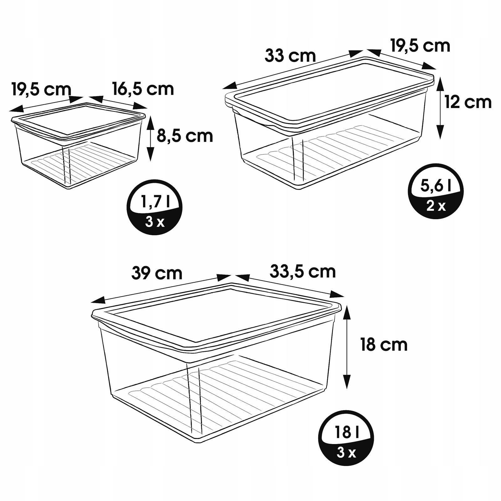 ✅ Pojemności: 3 x 1,7 l / 2 x 5,6 l / 3 x 18 l