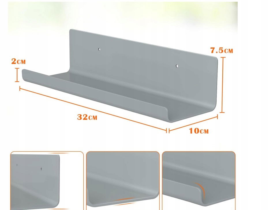 Półki o wymiarach 30 x 10 x 8 cm posiadają stabilną konstrukcję z wyższą płytą tylną, co zapewnia ich ogólną stabilność. Przednia barierka zapobiega przesuwaniu się przedmiotów, zapewniając ich bezpieczeństwo na półce.