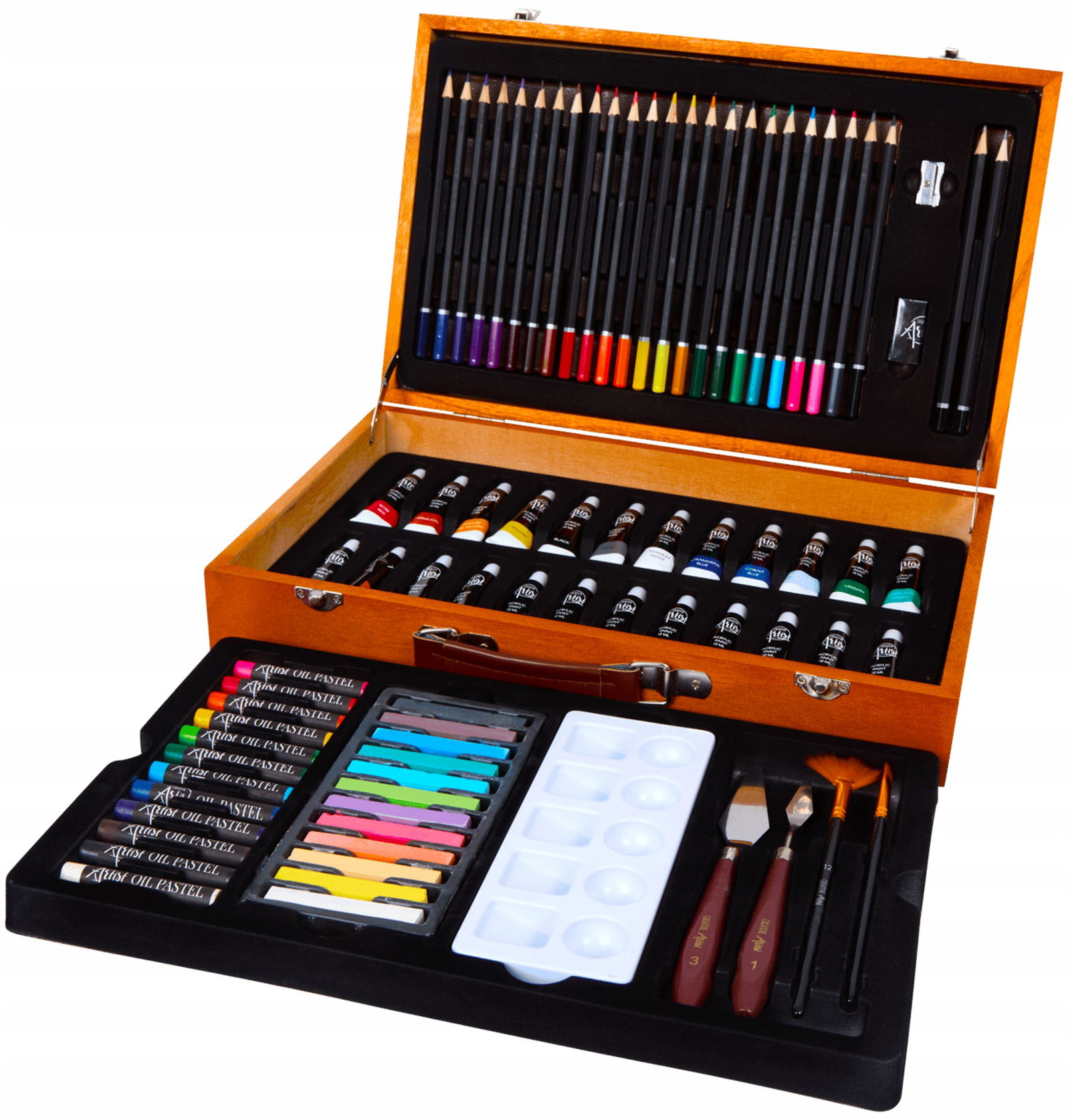 - ✨ Drewniana walizka ze skórzanym uchwytem – piękna i praktyczna, idealna do przechowywania wszystkich artystycznych skarbów!