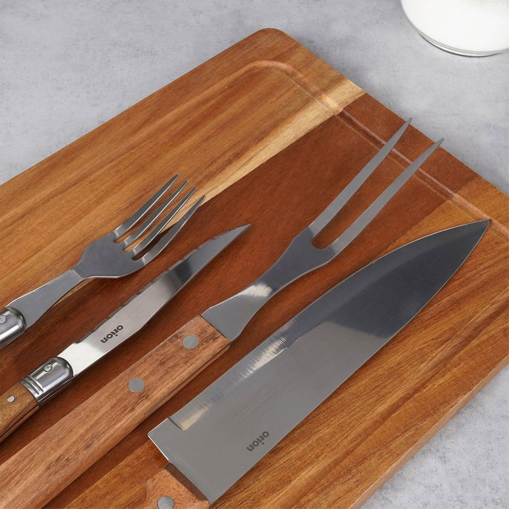Zestaw sztućców do steków i burgerów wraz deską oraz sztućcami do serwowania potraw, zapakowany w ozdobne pudełko w czarnym kolorze. W zestawie: 6x widelce o długości 22 cm, 6x noże do steków o długości 23 cm, długość ostrza noża wynosi 11 cm, 1x nóż szefa kuchni o długości 33 cm i 21 cm długość ostrza noża, 1x widelec do mięs o długości 33 cm, 1x deska do krojenia o wymiarach 37 x 23 x1,5 cm. Sztućce są niezwykle wygodne w użytkowaniu, dzięki odpowiednio wyprofilowanej rączce. Wykorzystamy je zarówno w domu, jak i podczas grillowania. W celu odpowiedniej konserwacji nie zaleca się mycia w zmywarce do naczyń.