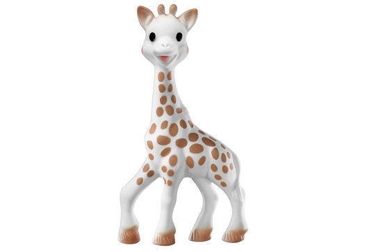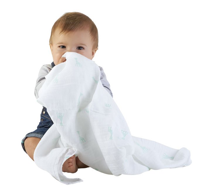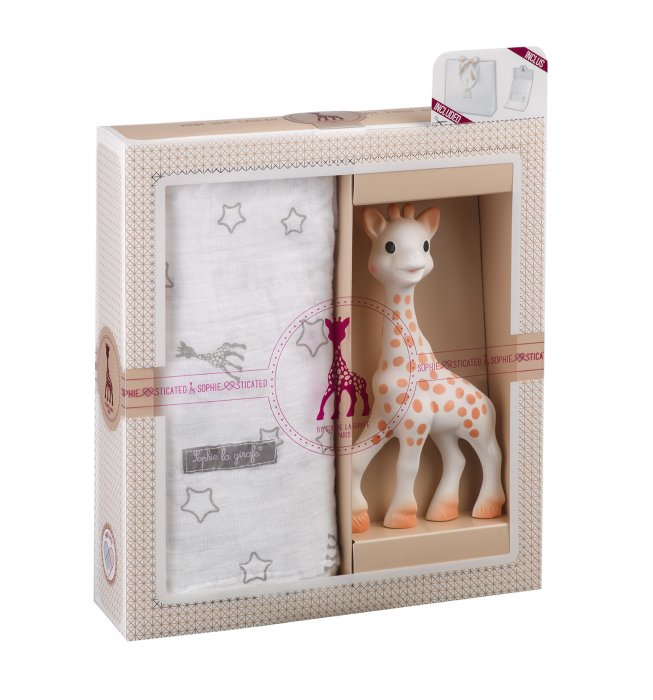 Śliczny zestaw narodzinowy w pięknym opakowaniu z kartką. Zawiera: – klasyczny gryzak Żyrafa Sophie, o wysokości ok. 18 cm., wykonany w 100% z lateksu – z żywicy drzewa gumowego. Naturalne tworzywo, pokryte farbą spożywczą, jest bezpieczne do żucia, lekkie i elastyczne, co chroni przed bolesnymi urazami podczas machania. Obłe kształty są łatwe do uchwycenia dla małej rączki. Gryzak stymuluje i rozwija 5 zmysłów : wzrok – kontrastowe cętki, słuch – piszczałka umieszczona w brzuchu, dotyk – specyficzny dotyk kauczuku, gładki jak skóra mamy, zapach – szczególny zapach naturalnej gumy, pozwalający odróżnić gryzak w stosie innych zabawek, smak – główny zmysł poznawczy maluszka. Doskonałe remedium na ząbkowanie; – duża muślinowa pielucha o wymiarach 120 cm x 120 cm. Niezbędna w codziennym życiu z maluszkiem. Może być wykorzystana na wiele różnych sposobów: jako kocyk, przykrycie do wózka, osłona przed słońcem, śliniak, podkładka do zmiany pieluchy, itp. Często niezastąpiony przytulaczek, bez którego maluszek nie może usnąć. Dzięki rozmiarowi i przewiewnej teksturze idealnie nadaje się do otulania maluchów bez ryzyka, że je przegrzejemy. Jest bardzo trwała: im więcej razy prana tym bardziej miękka się robi.