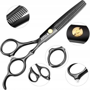 Wielofunkcyjność i wszechstronność - Nasz zestaw nożyczek fryzjerskich zawiera zarówno degażówki, idealne do przycinania końcówek włosów, jak i nożyczki do cięcia, które doskonale sprawdzą się w różnorodnych technikach fryzjerskich. Dodatkowo, zestaw uzupełnia praktyczny grzebień, który ułatwi stylizację i precyzyjne rozdzielanie włosów.