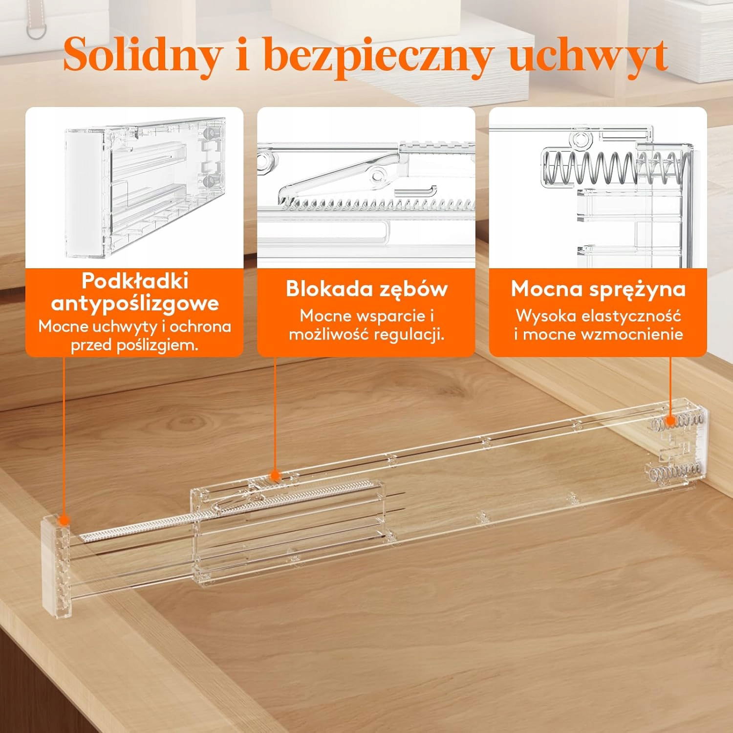 Regulowana długość – od 28 cm do 44,5 cm, wysokość 10 cm, szerokość 2 cm – pasuje do większości szuflad