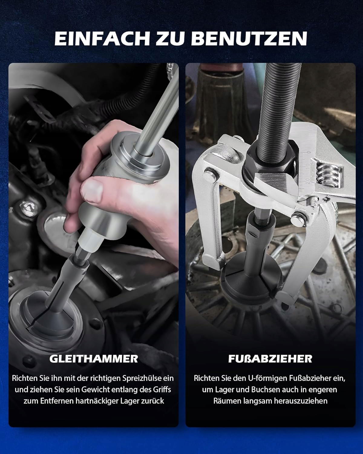 - -Szerokie zastosowanie: rozszerzalne tuleje zaciskowe i gwintowane adaptery śrubowe tego zestawu ściągacza suportu usuwają zablokowane i zablokowane osie, łożyska i tuleje w różnych pojazdach bez uszkadzania usuniętych części.