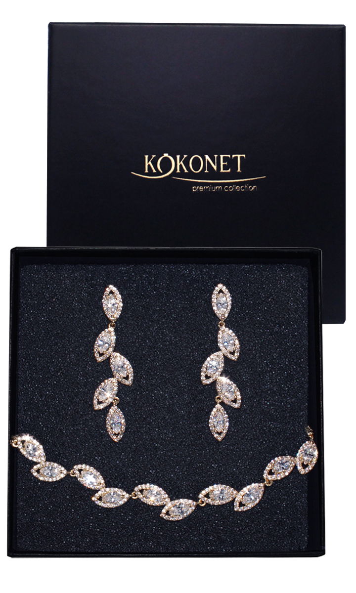 ZESTAW ślubny złoty Wiszące kolczyki i bransoletka motyw roślinny