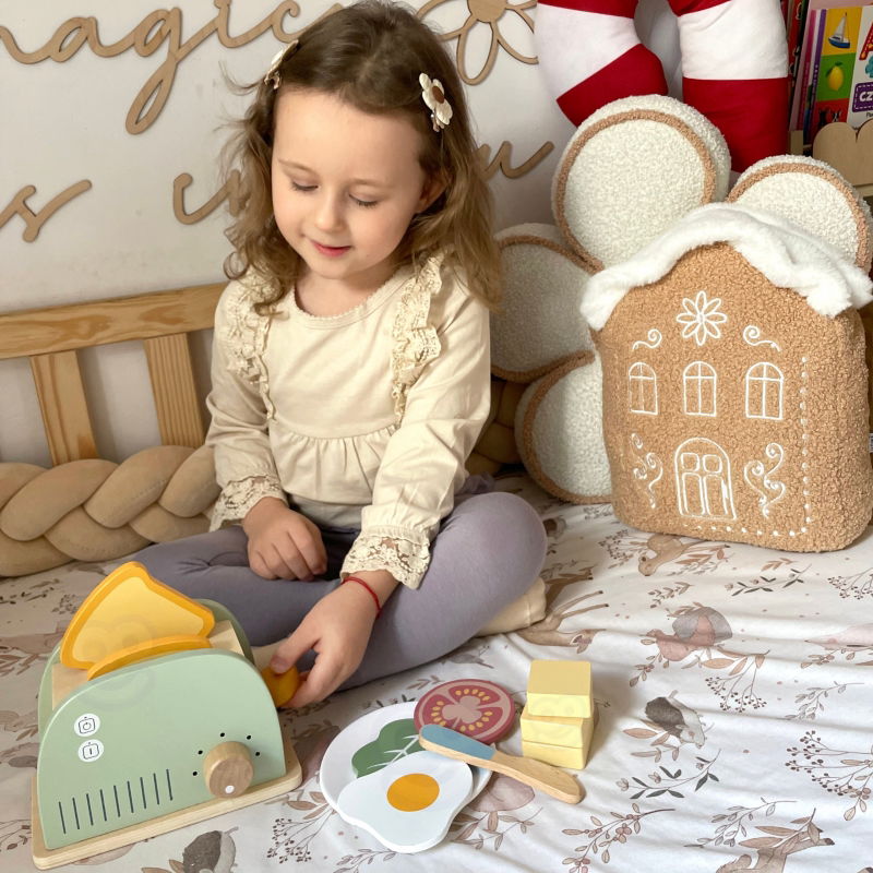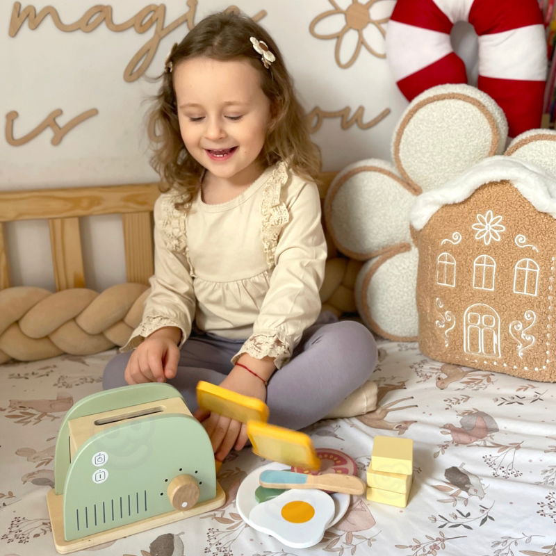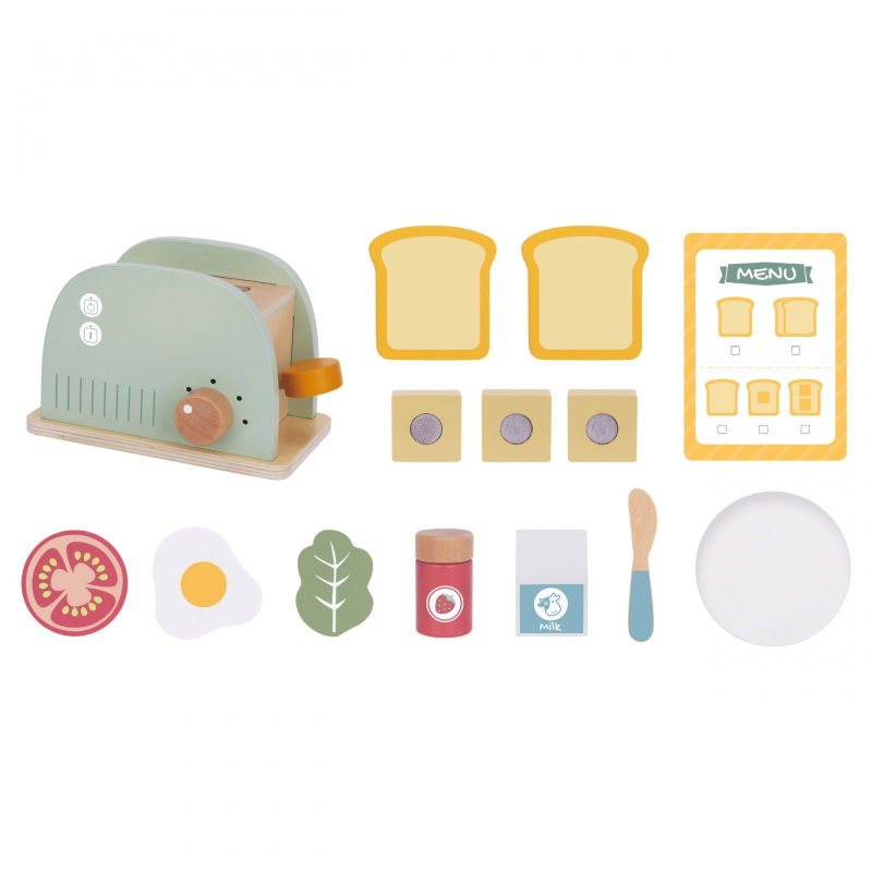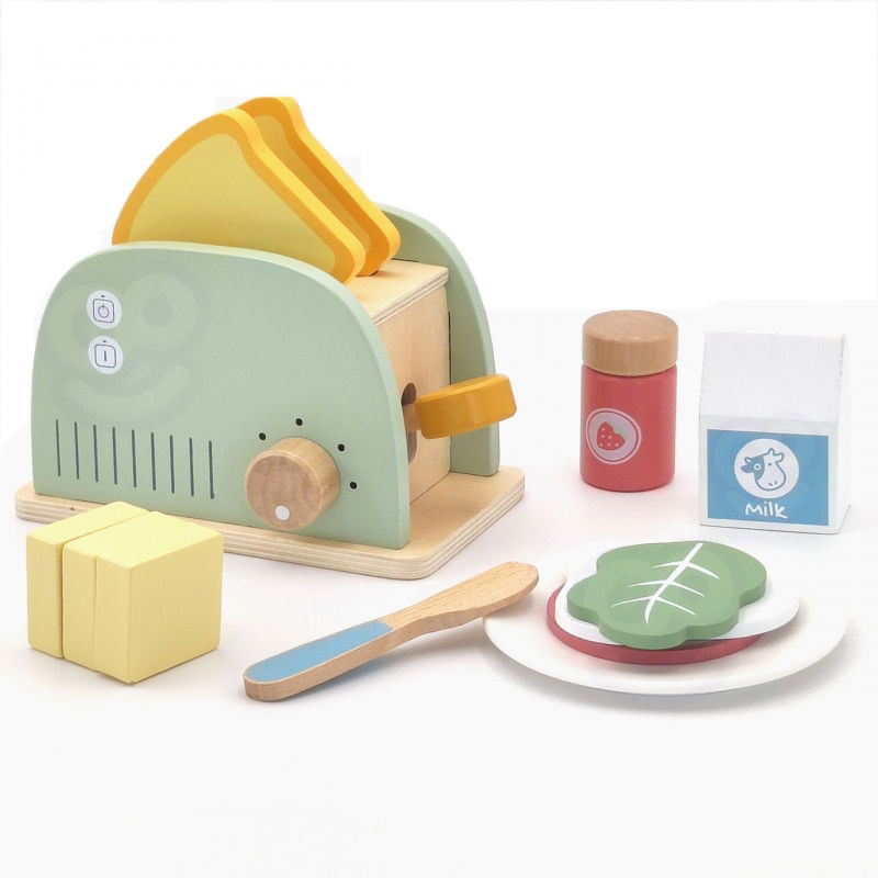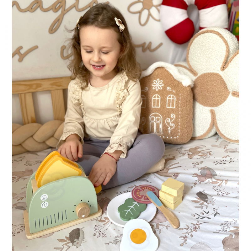 Idealny zestaw do zabawy w kuchni dla małych kucharzy! Drewniany toster z ruchomym pokrętłem i dźwignią do tostów, dwie kromki chleba, jajko sadzone, 3 kostki masła z nożykiem do smarowania, kartonik mleka, plasterki szynki, sera i listka sałaty, pojemnik z dżemem truskawkowym oraz kartę menu śniadaniowego. Zabawka wspiera rozwój zdolności manualnych, wyobraźni, myślenia logicznego, samodzielności oraz zmysłu dotyku i wzroku. Doskonała propozycja dla dzieci od 3 roku życia, wykonana z najwyższą jakością drewna i nietoksycznymi farbami. Pozwala na rozwijanie kreatywności i umiejętności społecznych poprzez zabawę w gotowanie i naśladowanie dorosłych. Idealny prezent, który uczy i bawi jednocześnie!